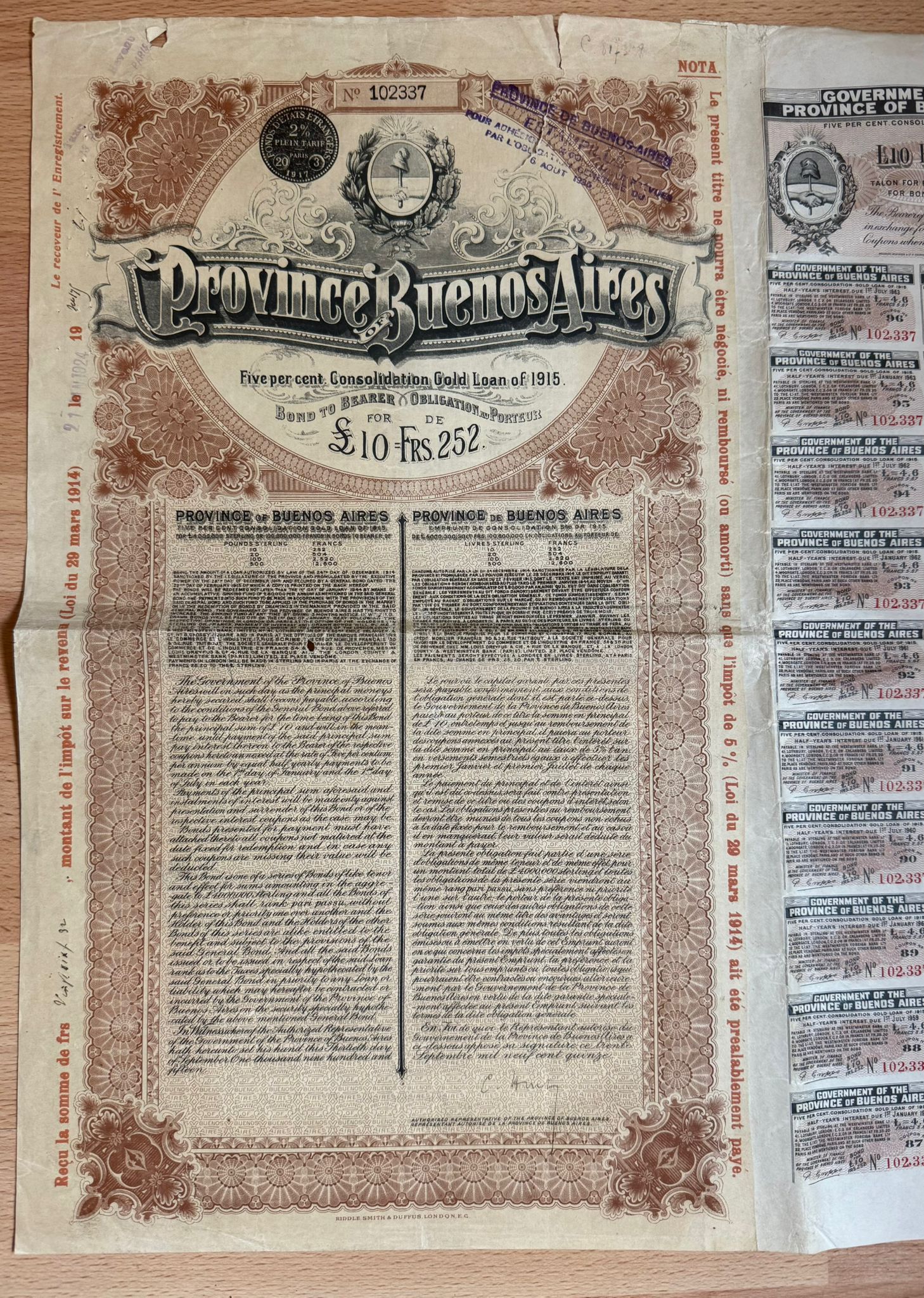 Highly decorative bond issued by the Province of Buenos Aires in 1915, as part of the Five per cent Consolidation Gold Loan. Printed in English and French, with beautiful typographic design and ornate border. Includes full coupons and tax annotations. A fine example of early 20th-century South American debt instruments aimed at European investors.