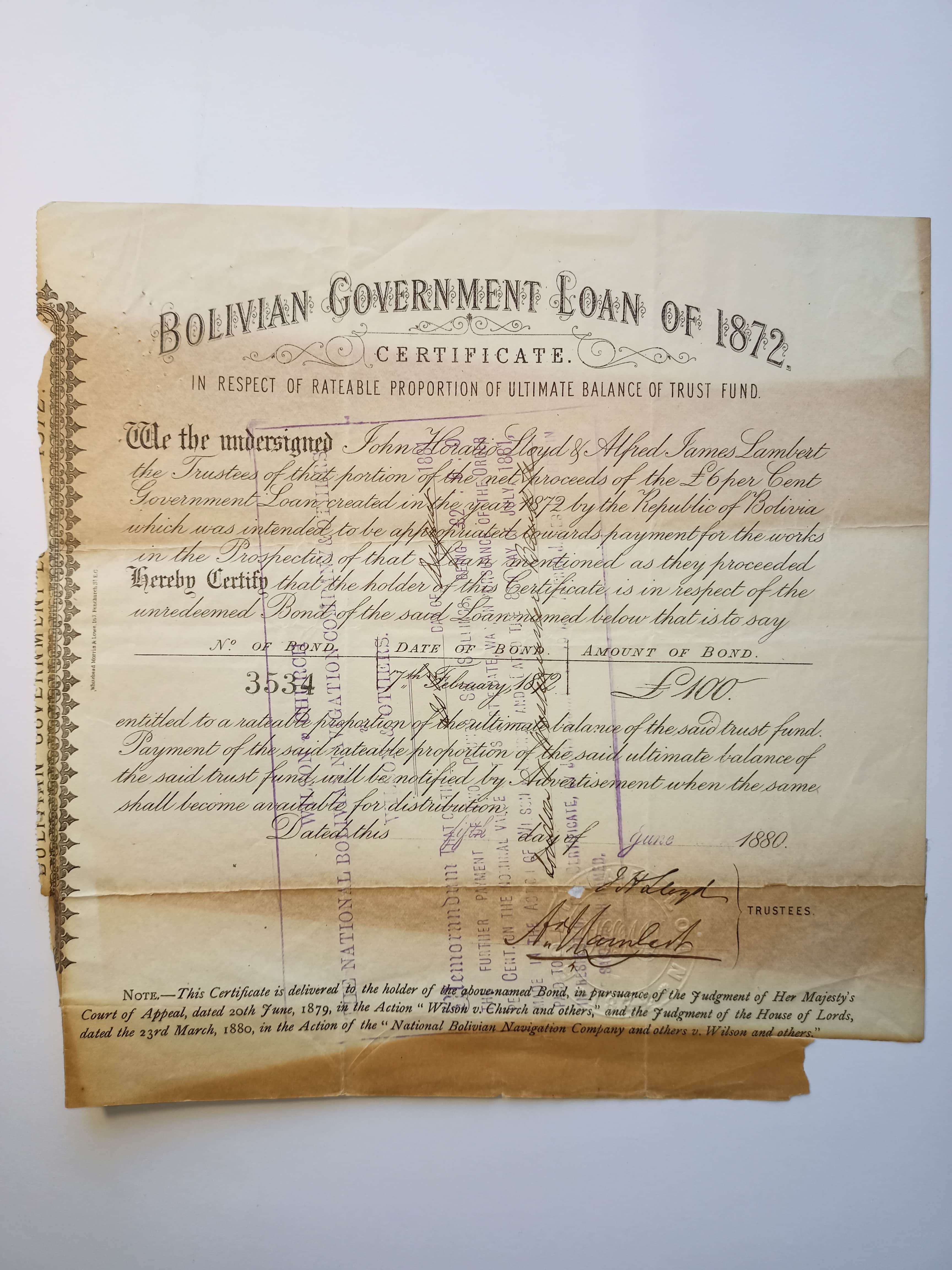 Certificate from the Bolivian Government Loan of 1872, relating to the 6% bond issue for infrastructure development. This certificate represents a claim to the remaining balance from the trust fund, dated 1880. Scarce South American debt history collectible.
