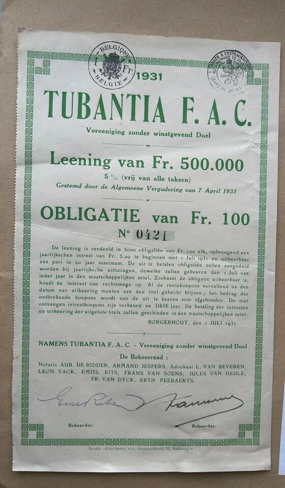 Historic bond from Tubantia F.A.C., a Belgian football association issuing a 100 francs obligation in 1931 to support club activities. Printed in green with official stamps and signatures, this piece highlights local football heritage.