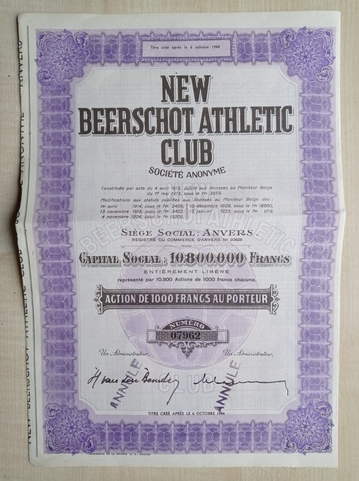 A 1000 francs share certificate from the New Beerschot Athletic Club issued in 1944. This Antwerp-based club was part of Belgium’s sporting history. Attractive violet border and detailed layout make it a classic collector’s piece. Stamped and cancelled.