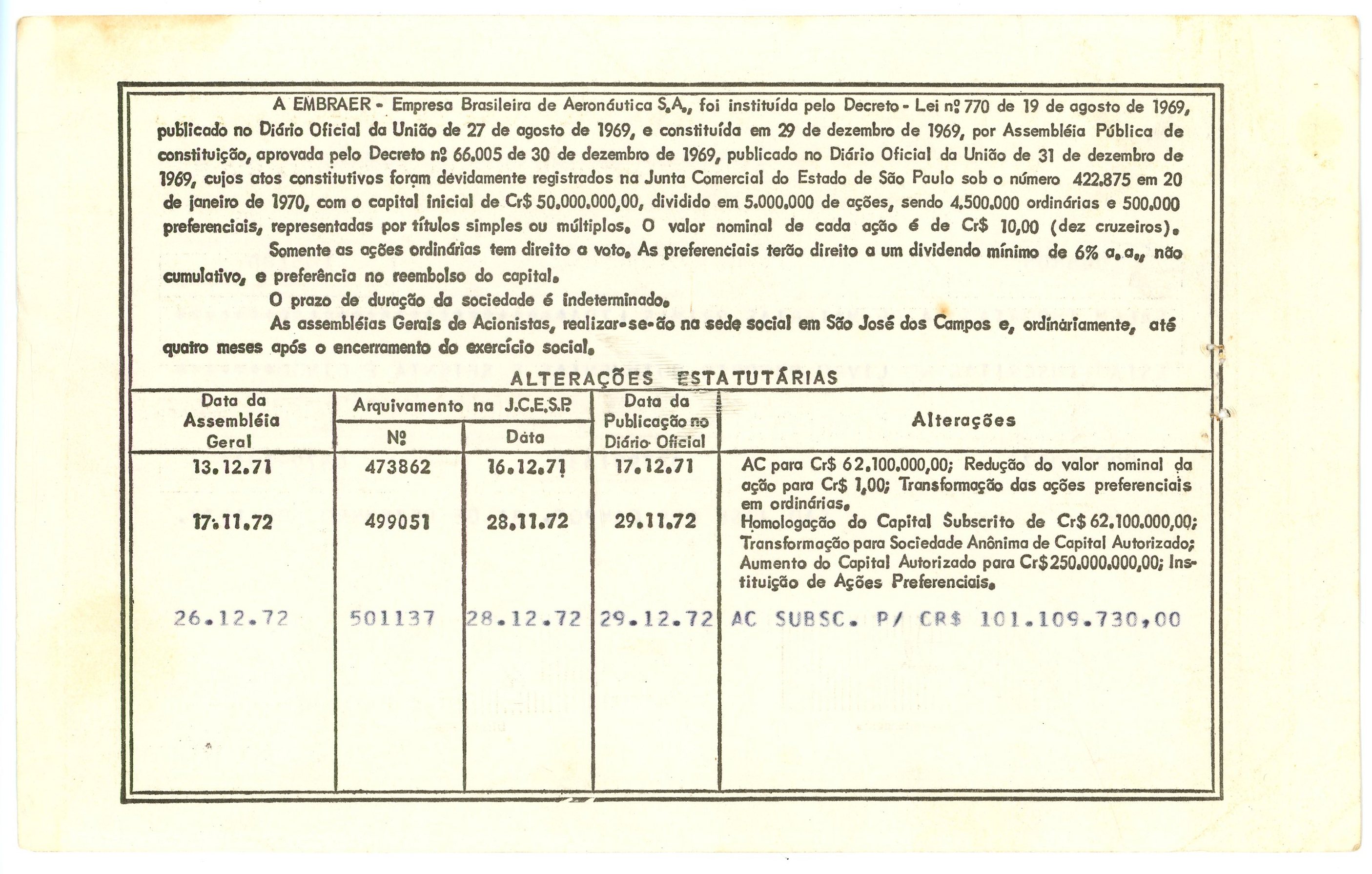 Brazil Embraer Embresa Brasileira de Aeronautica SA Preferred Shares 1972