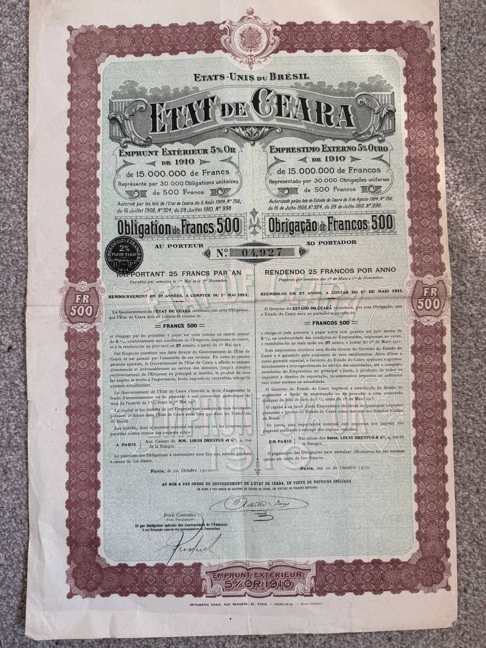 Brazil 1910 State of Ceará (Brazil) – 5% Gold External Loan Bond – 500 Francs - Coupons