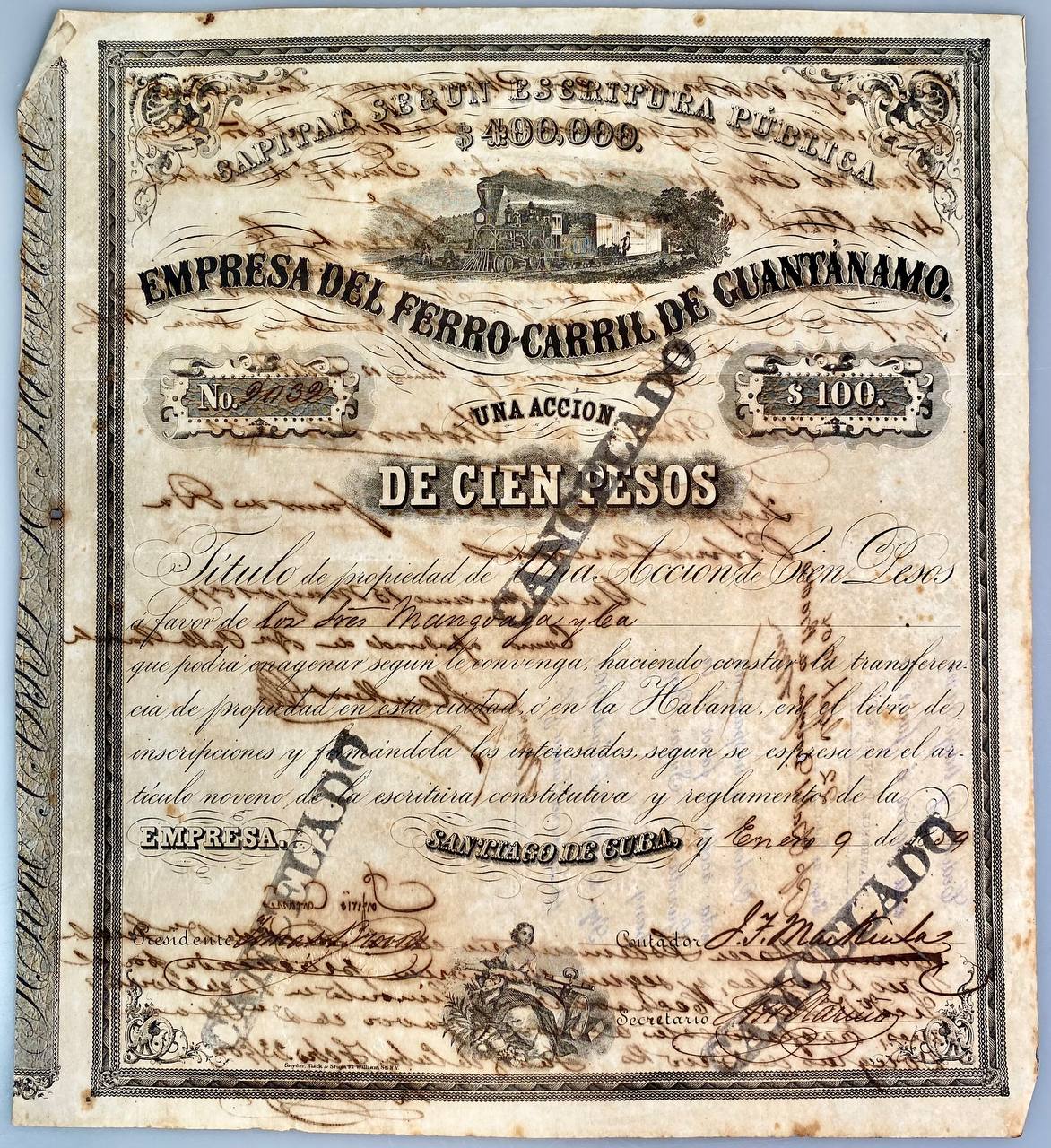 Cuba Empresa del Ferrocarril del Guantanamo Accion de 100 Pesos 1877