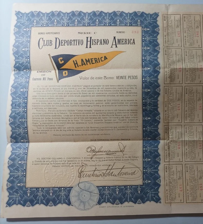 Rare 20th-Century Cuban Football Bond – Club Deportivo Hispano América. This historic mortgage bond from Club Deportivo Hispano América, a Cuban football club, is a rare and visually striking piece of sports and financial memorabilia. Issued for 20 pesos, it was part of a larger 40,000-peso fundraising effort to support the club’s development. The document features an elegant green patterned border, an official club flag emblem in gold and blue, and a detailed coupon sheet for periodic interest payments. The signatures and embossed seal further enhance its authenticity.