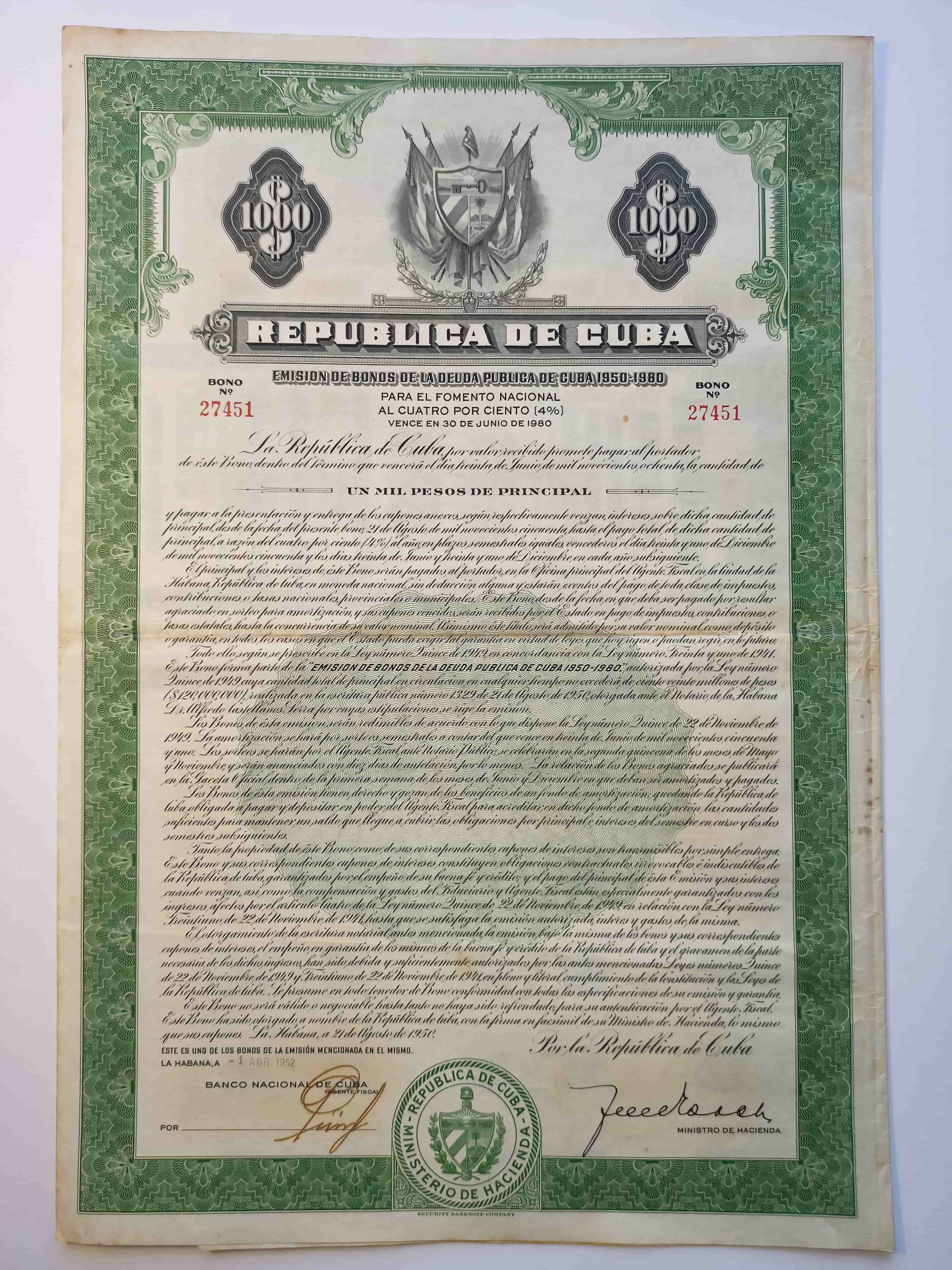Large and impressive bond issued by the Republic of Cuba in 1952, part of the 4% Public Debt issue maturing in 1980. Green border with Cuban coat of arms. Issued to raise funds for national development projects.