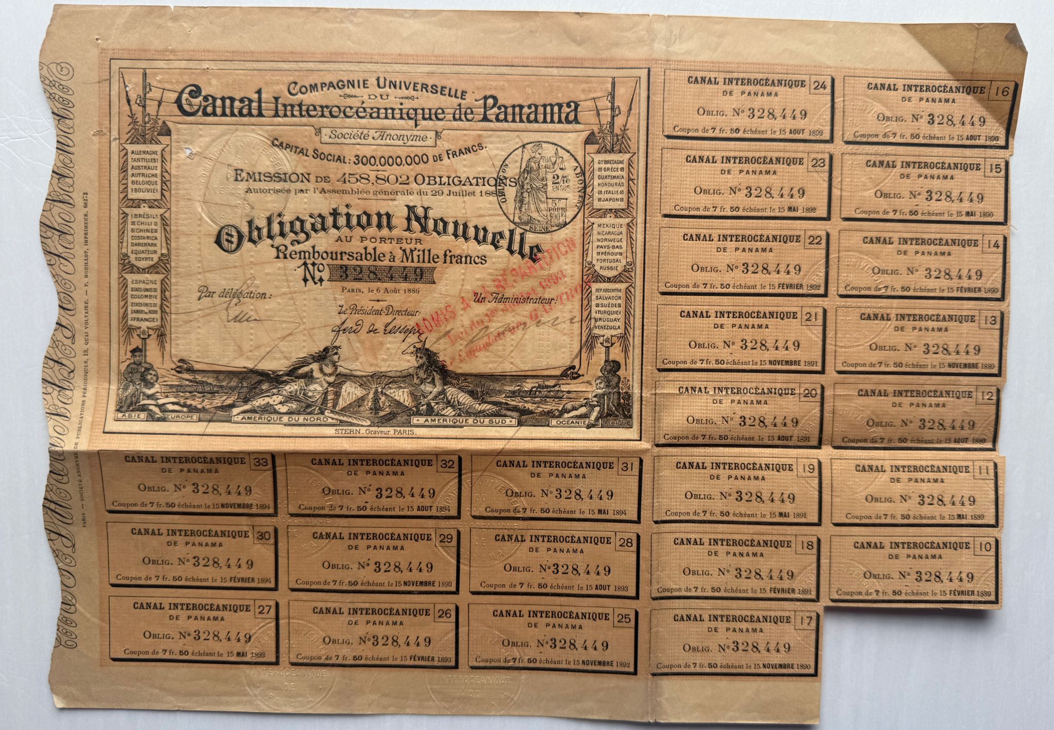 Historic bearer bond from the failed Panama Canal project. Issued in 1886 by the French Panama Canal Company. Includes numerous coupons and intricate engravings. A notorious financial scandal involving Ferdinand de Lesseps. Essential for collectors of financial fraud and speculative ventures.