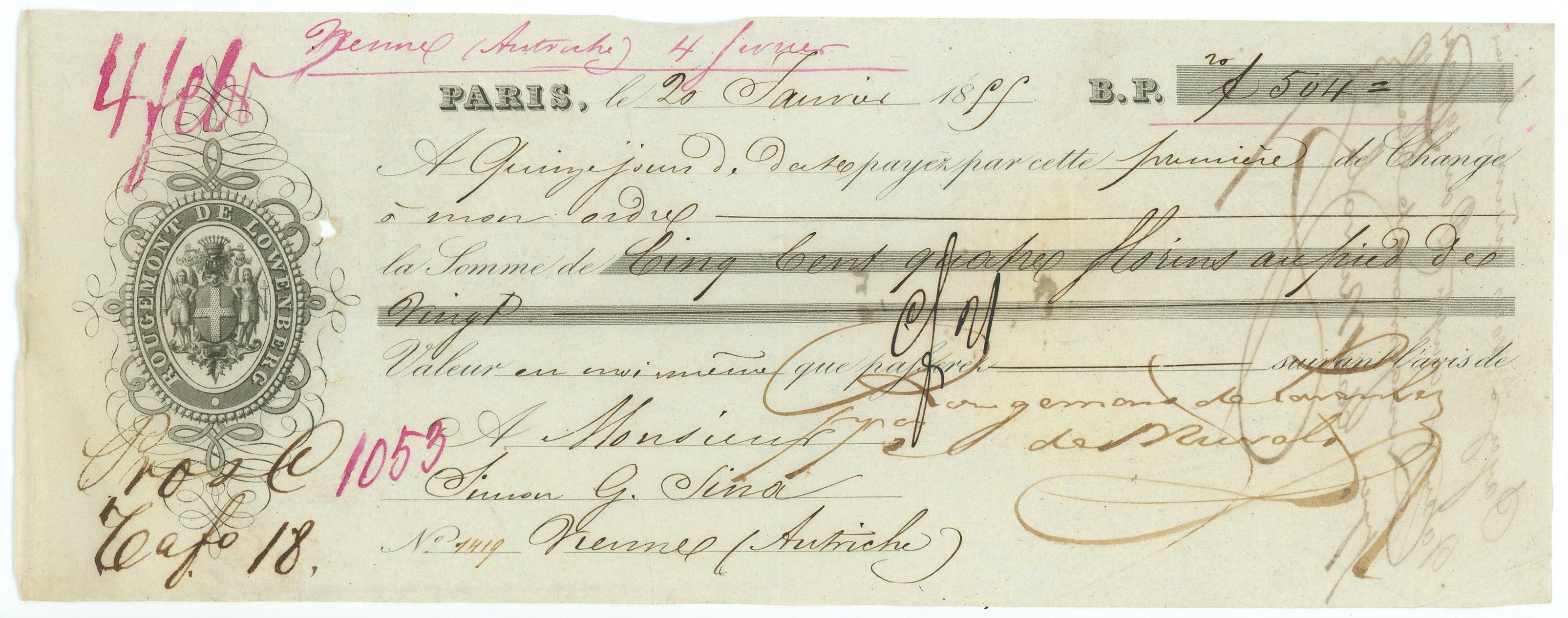 # 1419 Hand-signed by Denis de Rougemont de Löwenberg, a prominent Swiss-French banker during Napolenic time and once second-biggest shareholder of the Banque de France. XF