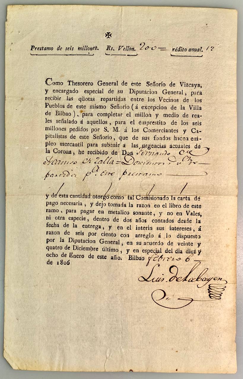 Spain Senorio de Bilbao Prestamo de 6 Milliones Obligacion de 200 Reales Vellon 1806