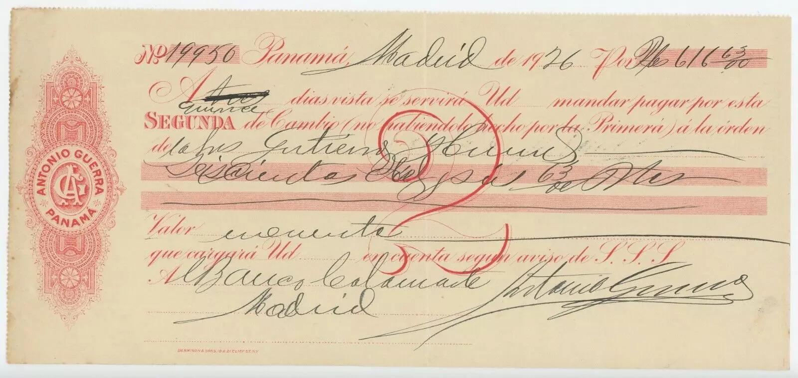This rare historical bill of exchange (letra de cambio) was issued in Panama by Antonio Guerra and payable to Banco Español de Crédito, Madrid. It is a Second Bill of Exchange (Segunda), part of a traditional set of two bills (Primera y Segunda) used for international financial transactions.