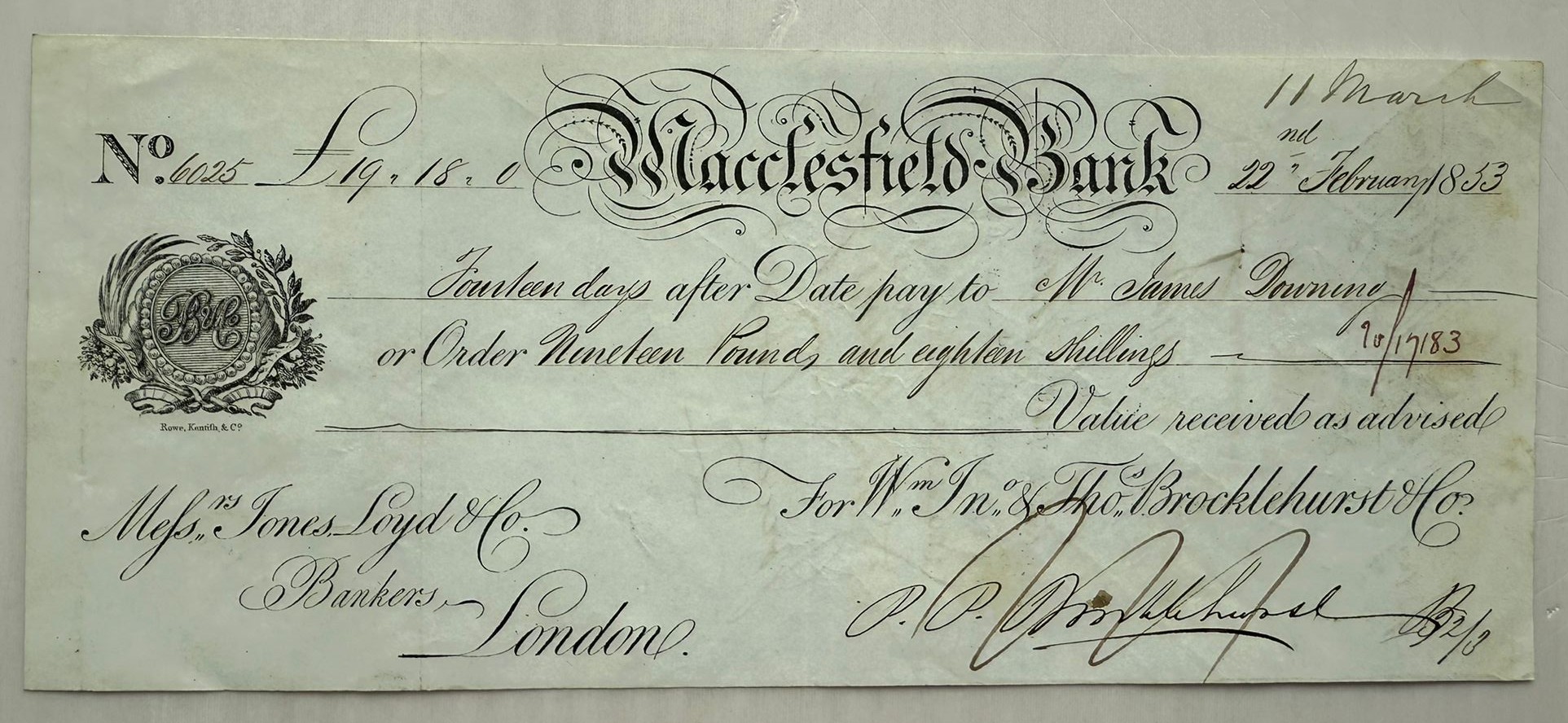Elegant and beautifully calligraphed bill of exchange issued by Macclesfield Bank in 1853. Addressed to London bankers, featuring a rare provincial UK financial institution. A charming piece of British banking history.