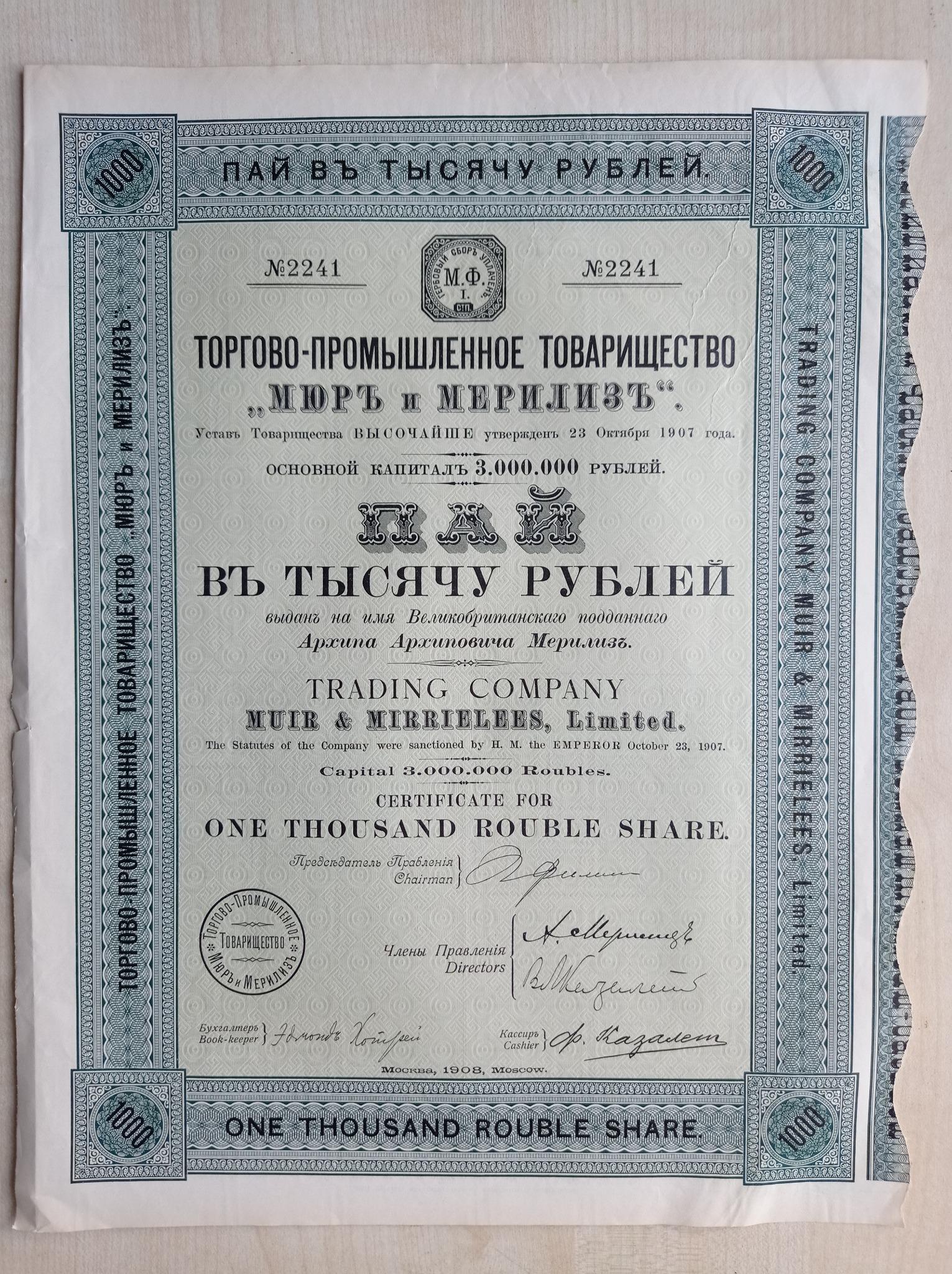 Share certificate for 1000 Rubles issued by Muir & Mirrielees, the famous British-Russian trading house operating one of Russia’s largest department stores. Dated 1908, with both Russian and English text. A key piece of Imperial commercial history.