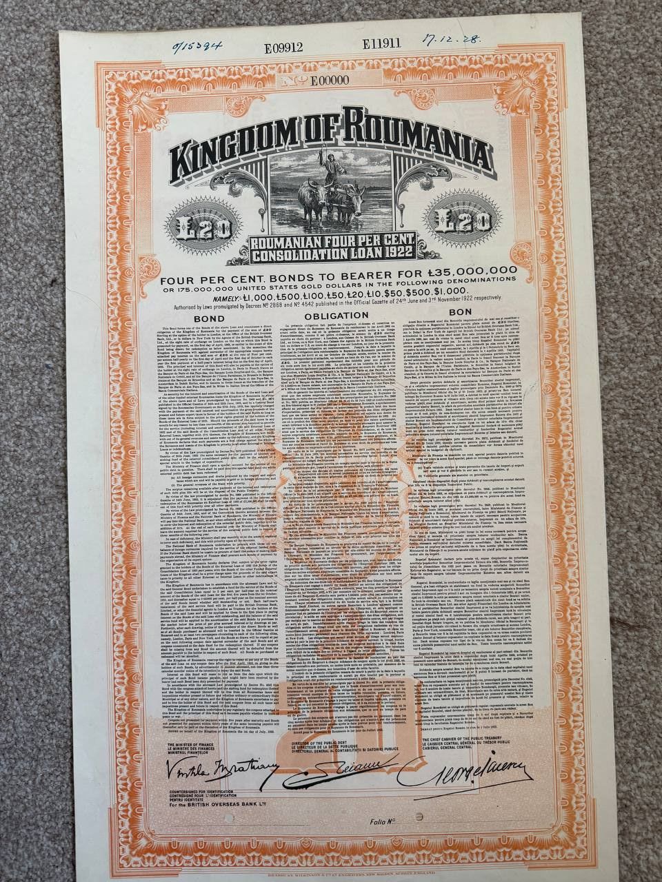 Historic £20 bearer bond issued under the 1922 Kingdom of Roumania 4% Consolidation Loan. Printed in ornate orange with detailed terms in English, French, and German. Issued under the supervision of the British Overseas Bank Ltd.