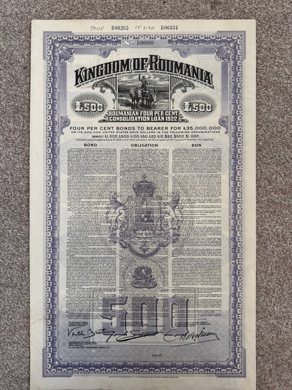 High-denomination £500 specimen of a bearer bond from the Kingdom of Roumania’s 1922 loan issue. Rich purple engraving with detailed multilingual text and official signatures. A rare large-format specimen of sovereign debt.