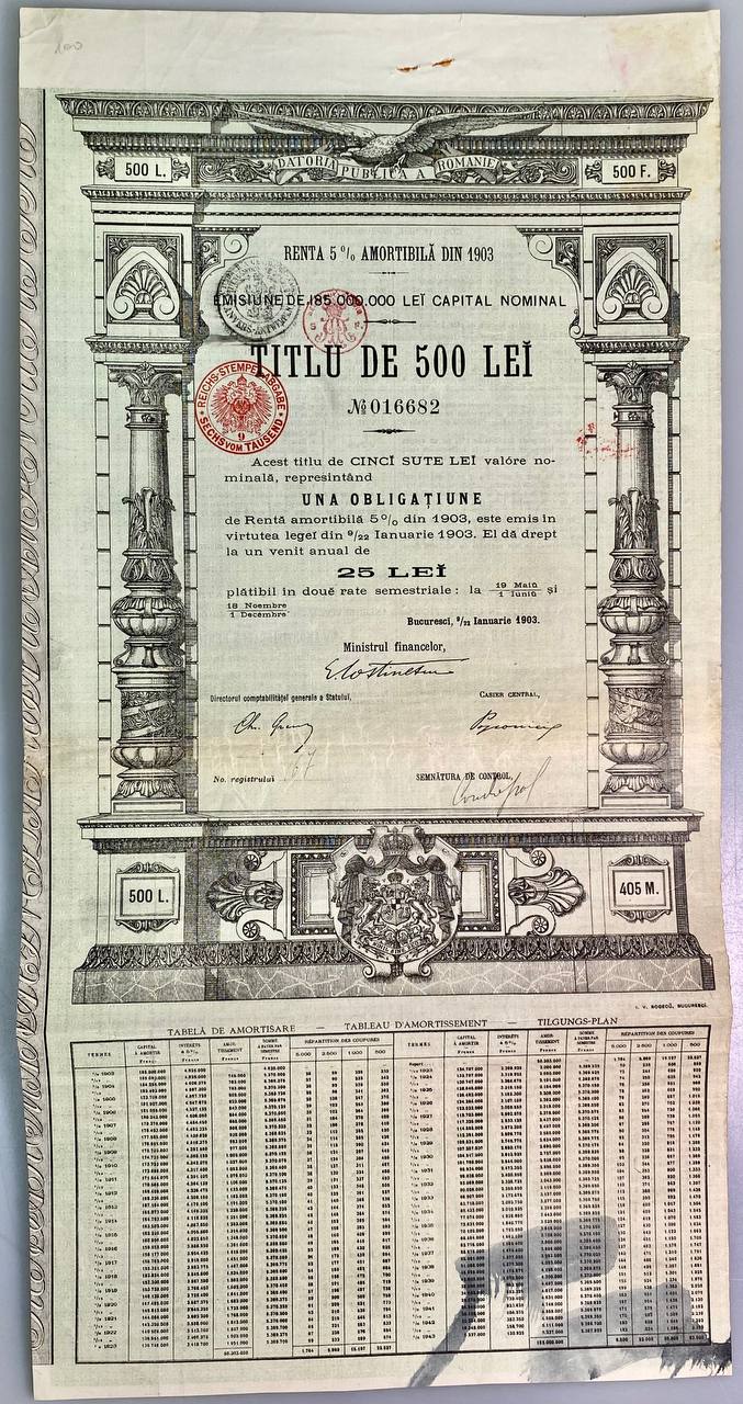 Romania Renta 5% Amortibila din 1903 Titlu de 500 Lei 1903 Uncancelled