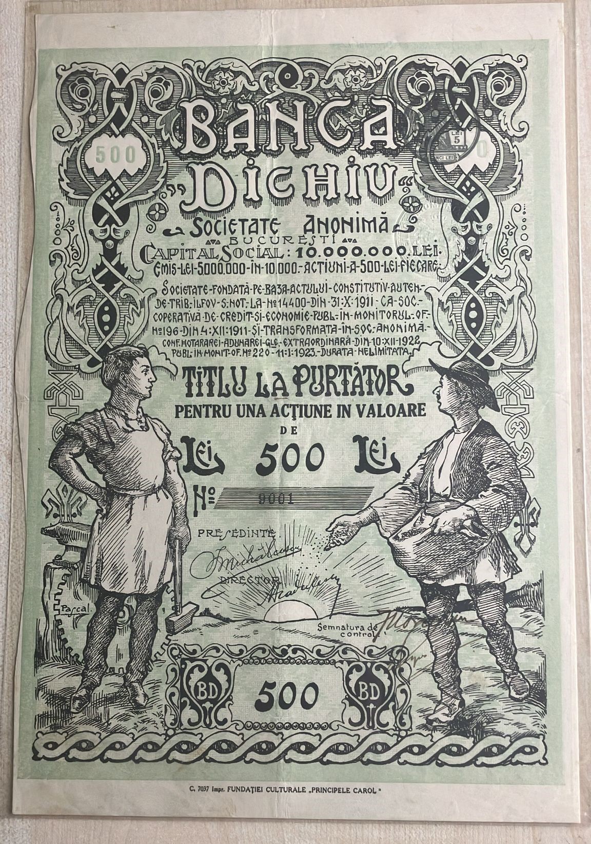 Art Nouveau-styled share certificate from Banca Dichiu. Beautifully illustrated with rural Romanian figures, highlighting the cooperative’s role in public credit and savings before WWII. A rare design and a valuable glimpse into interwar Romanian finance.