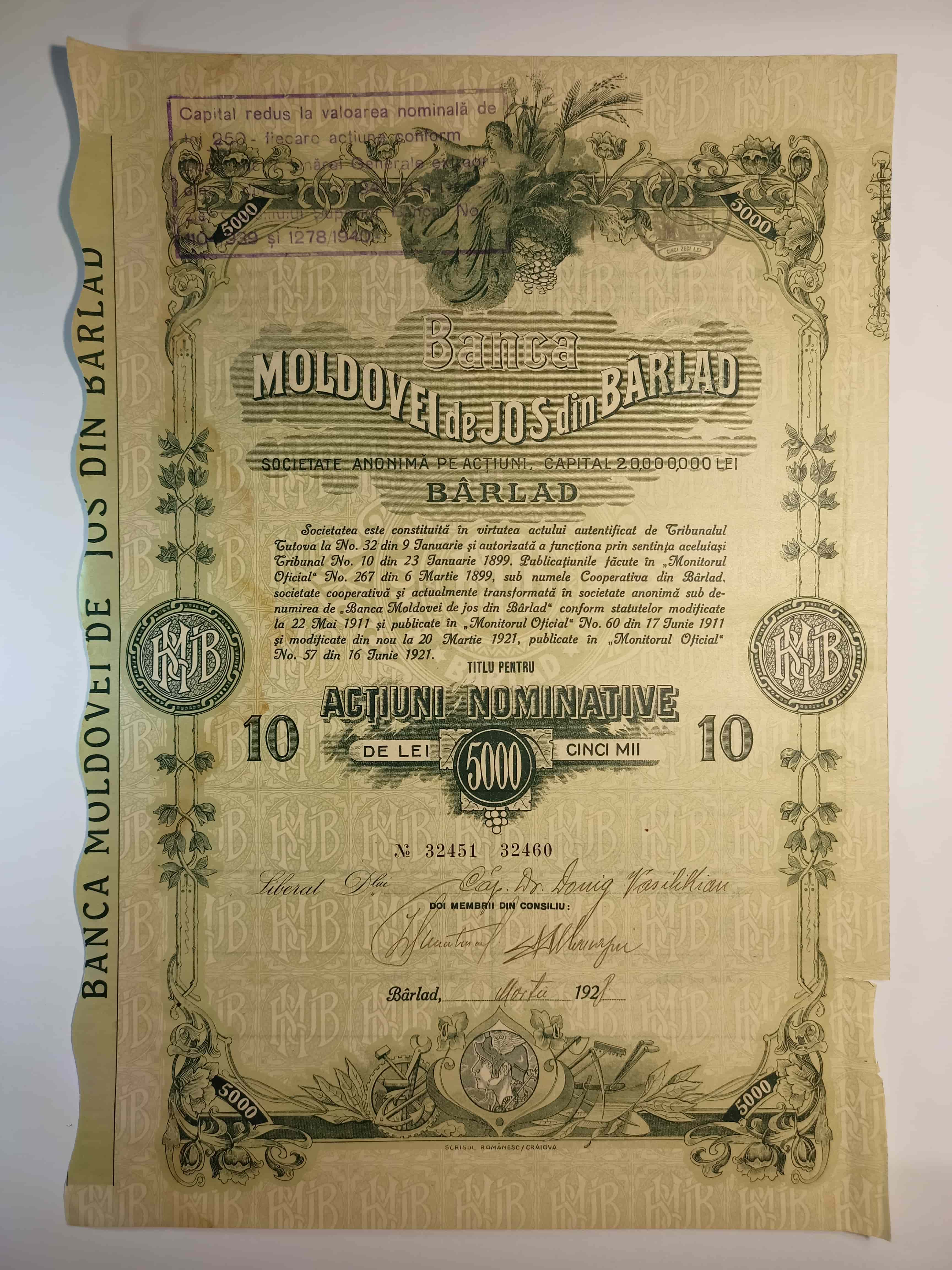 Beautiful 1927 share certificate from Banca Moldovei de Jos din Bârlad, issued for 5000 Lei. Features ornate floral border and intricate bank monogram ‘BMB’. Founded in Bârlad, Romania, the bank served as an important regional financial institution in the interwar period. Capital reduction details stamped on the top. A fine example of Romanian banking history.