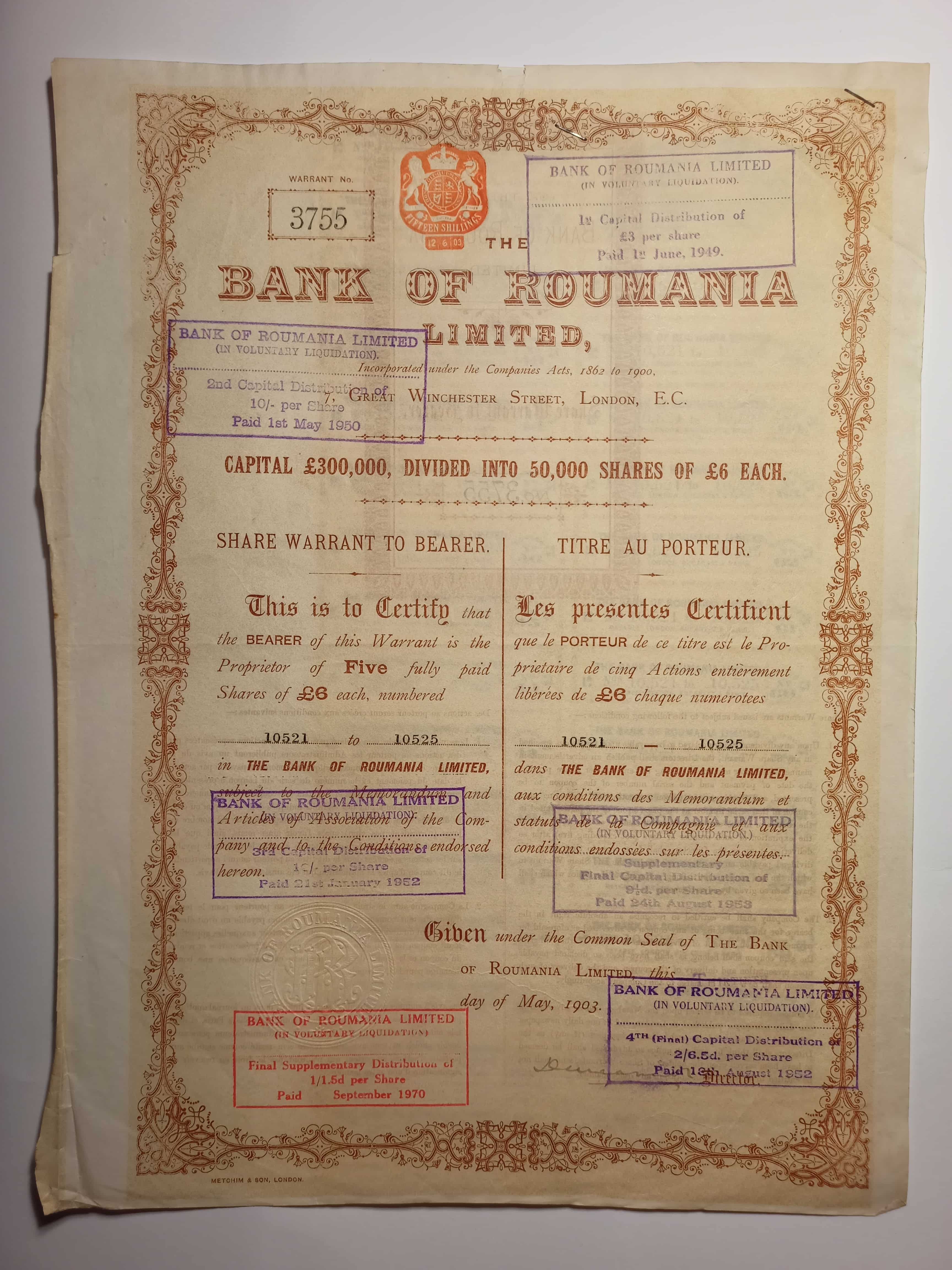 Early 20th century share warrant to bearer from the Bank of Roumania Limited, incorporated in London in 1903 with a capital of £300,000. This document represents 5 shares of £6 each. Multiple purple liquidation distribution stamps from 1949–1970 record the bank’s closure history. Printed by Metchim & Sons, with ornate orange border and embossed seal. A fascinating Anglo-Romanian financial connection.