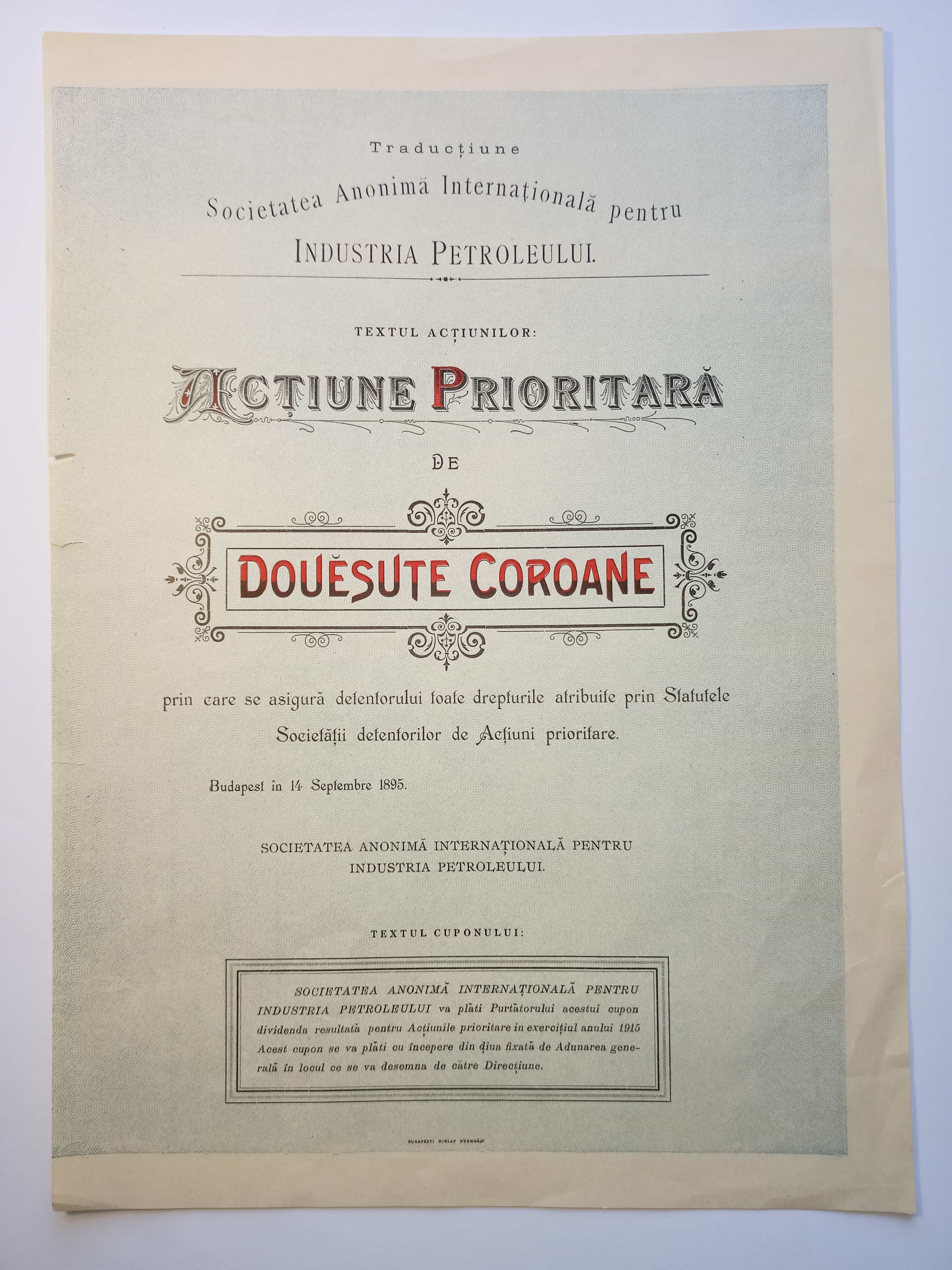 Romanian priority share (Acțiune Prioritară) issued in Budapest for the International Petroleum Industry Company. Denomination 200 crowns. Elegant late 19th-century design, reflecting the importance of Romania’s oil industry in Europe.