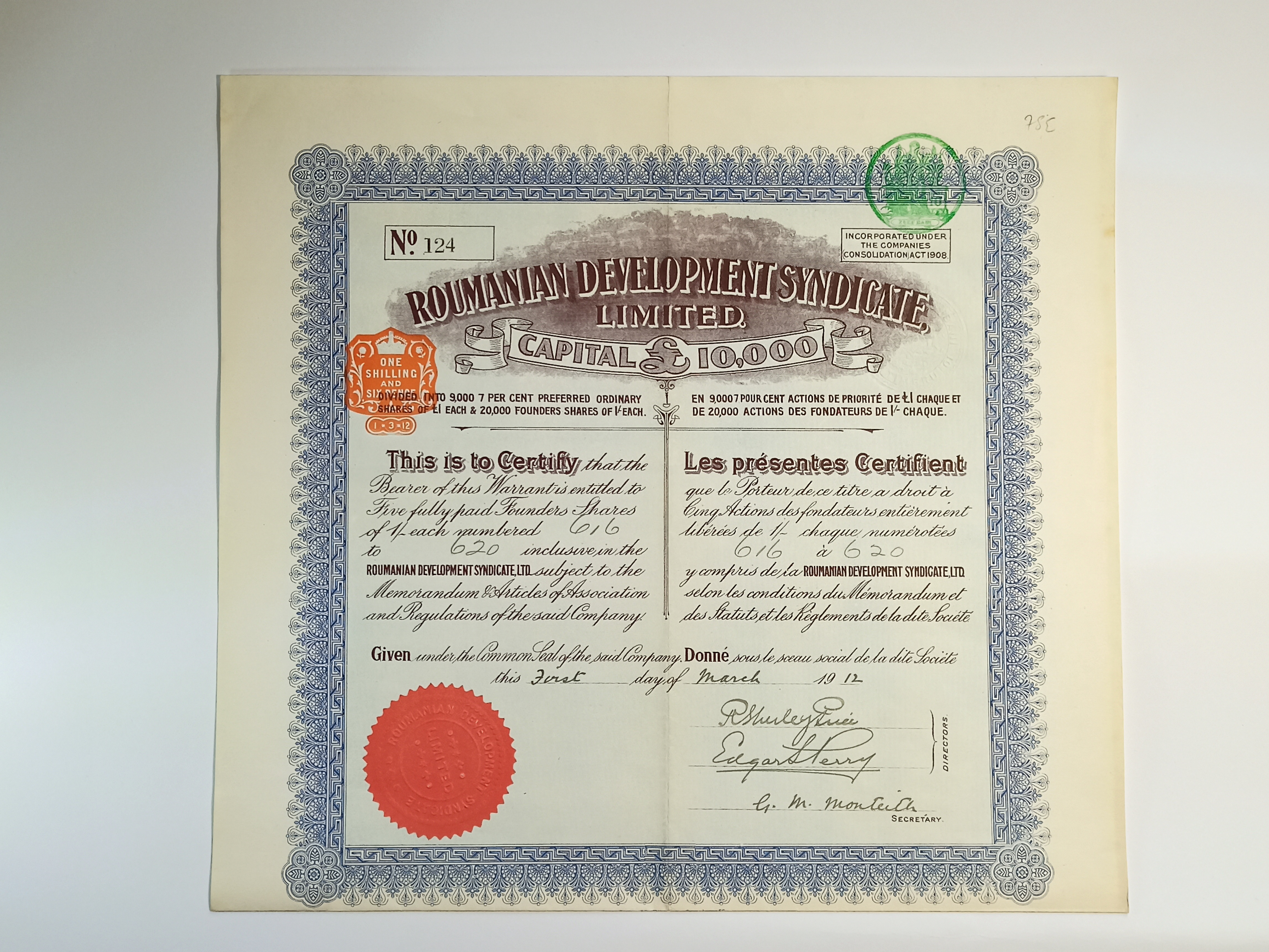 Bilingual founders share warrant (English/French) from Roumanian Development Syndicate Ltd., issued in London in 1912. Capital £10,000. Vibrant blue-and-brown design with red wax seal. A rare and historic specimen of early British-Romanian ventures.