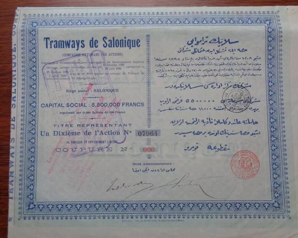 Ottoman Turkey Greece Tramways de Selanik Salonika 1892 1/10 of Share