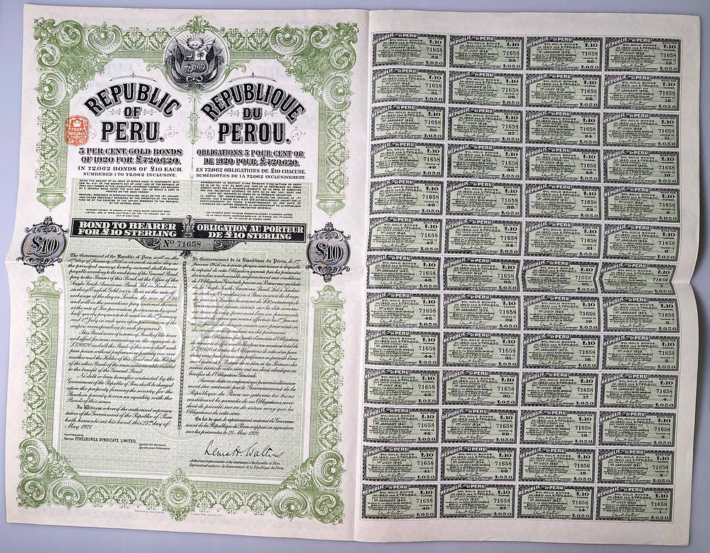 Attractive and colorful $10 sterling bond issued by the Republic of Peru in 1927. This 3% Gold Bond of 1927 comes with a full sheet of coupons. An excellent representation of Latin American sovereign debt with ornate green border and bilingual (English-French) layout. Printed by Waterlow and Sons