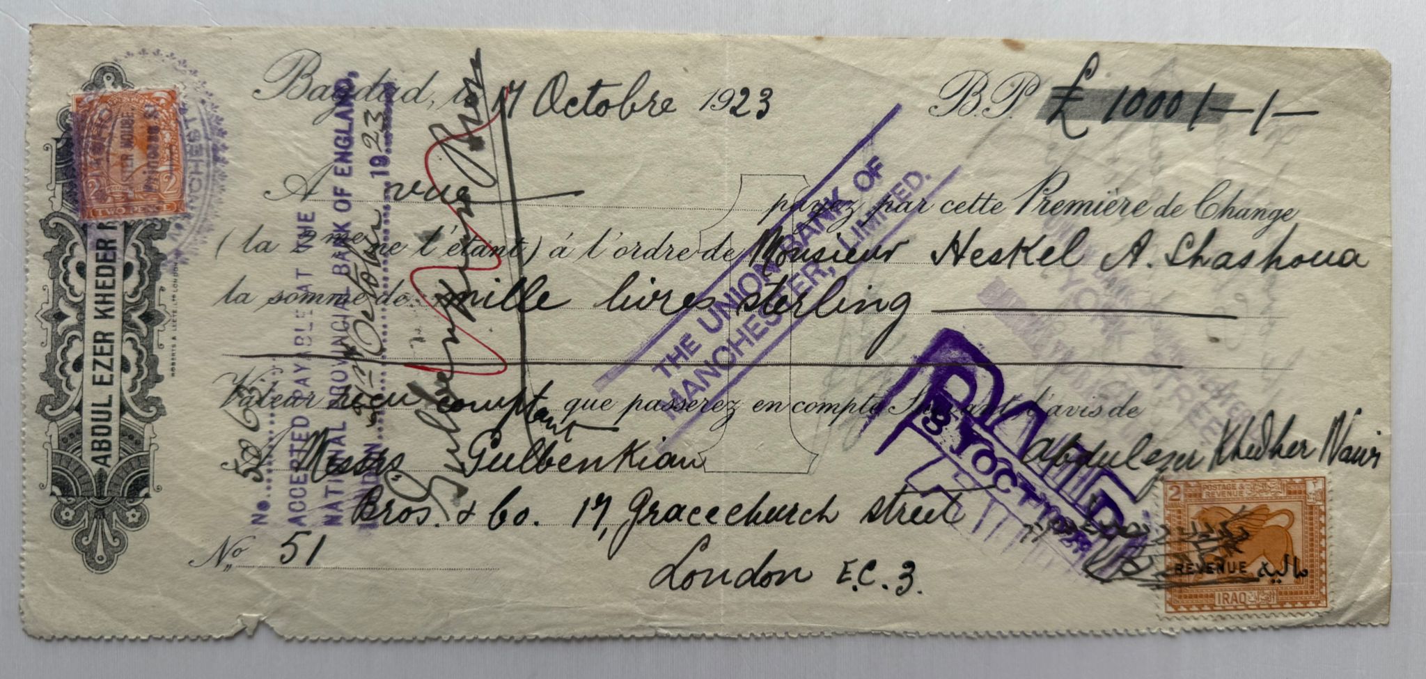 Rare large-value Iraqi bill of exchange from Baghdad dated 1923, in favor of Heskiel A. Shashoua. Issued for 1000 pounds sterling. Notable stamps from The Union Bank of Manchester and Iraqi revenue stamps. A superb example of cross-border finance in the interwar Middle East.
