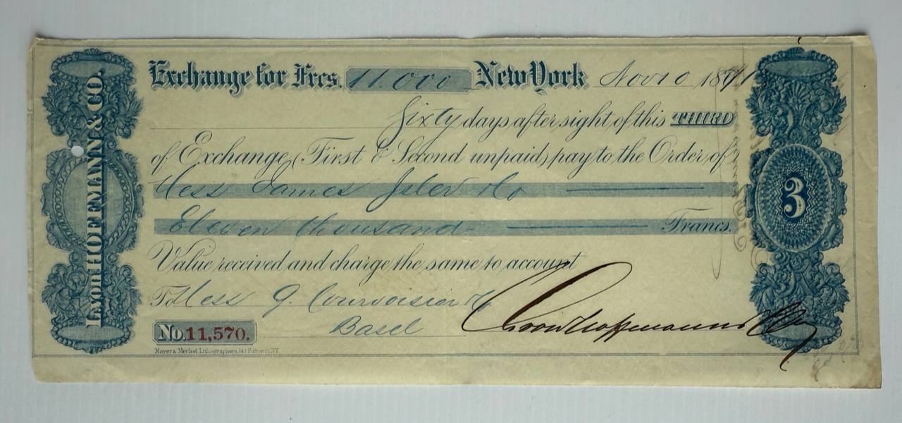 Third bill of exchange issued by L. von Hoffmann & Co. in New York, featuring exquisite blue design. Issued for 11,000 Francs to Basel, this rare financial document reflects Swiss-American commercial links of the 19th century.