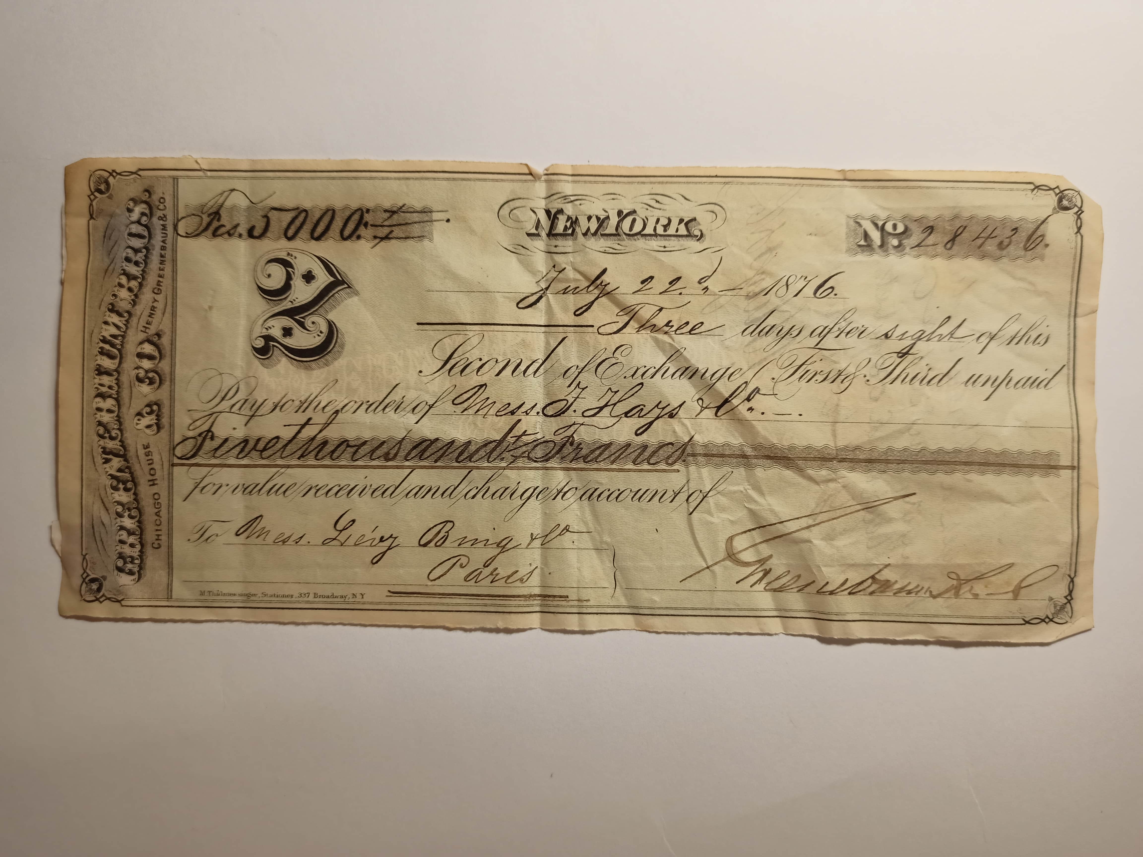 Historic bill of exchange issued in New York in 1876 by Greenebaum Bros. for 5000 Francs payable in Paris. Cross-border financial document connecting American and European banking networks of the 19th century. Handwritten details and ornate design add character. A fine collectible for early U.S. financial history.