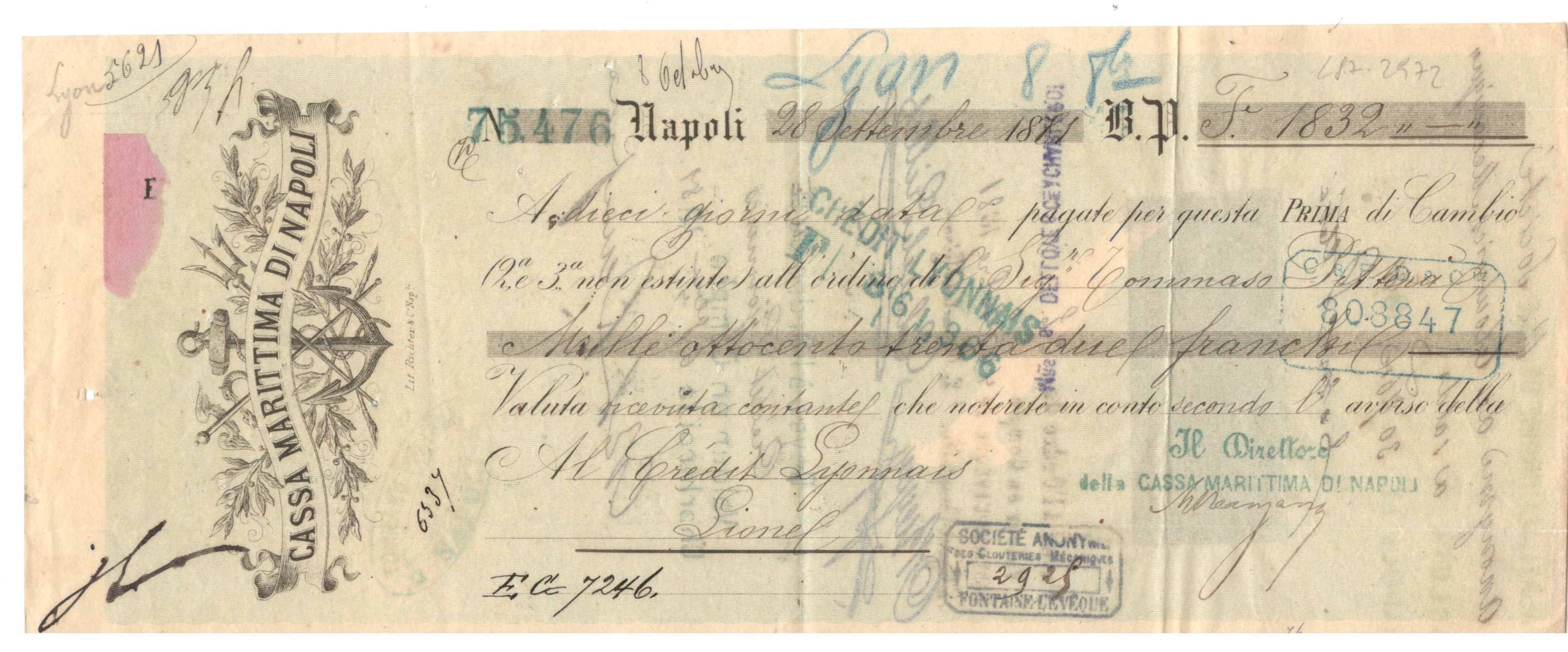 Rare maritime-themed bill of exchange issued in Naples by the Cassa Marittima di Napoli in 1871. The document is artistically adorned with naval emblems, adding strong collectible value for maritime and finance enthusiasts. Endorsed in Lyon, with French and Italian financial notations. Maritime Finance Theme.