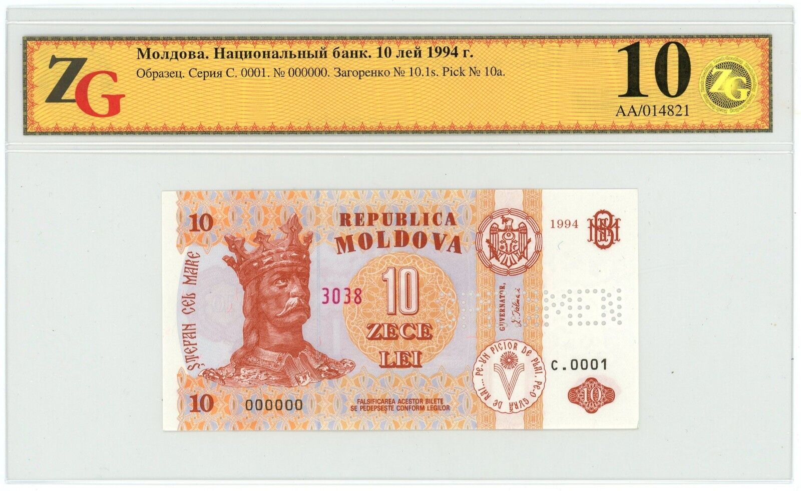 Specimen 10 Lei banknote from the Republic of Moldova issued in 1994. Features Stefan cel Mare. Unnumbered specimen (000000) with serial C.0001. Pick #10a, Numista #MOL103. A high-grade collectible with full security features and excellent presentation.