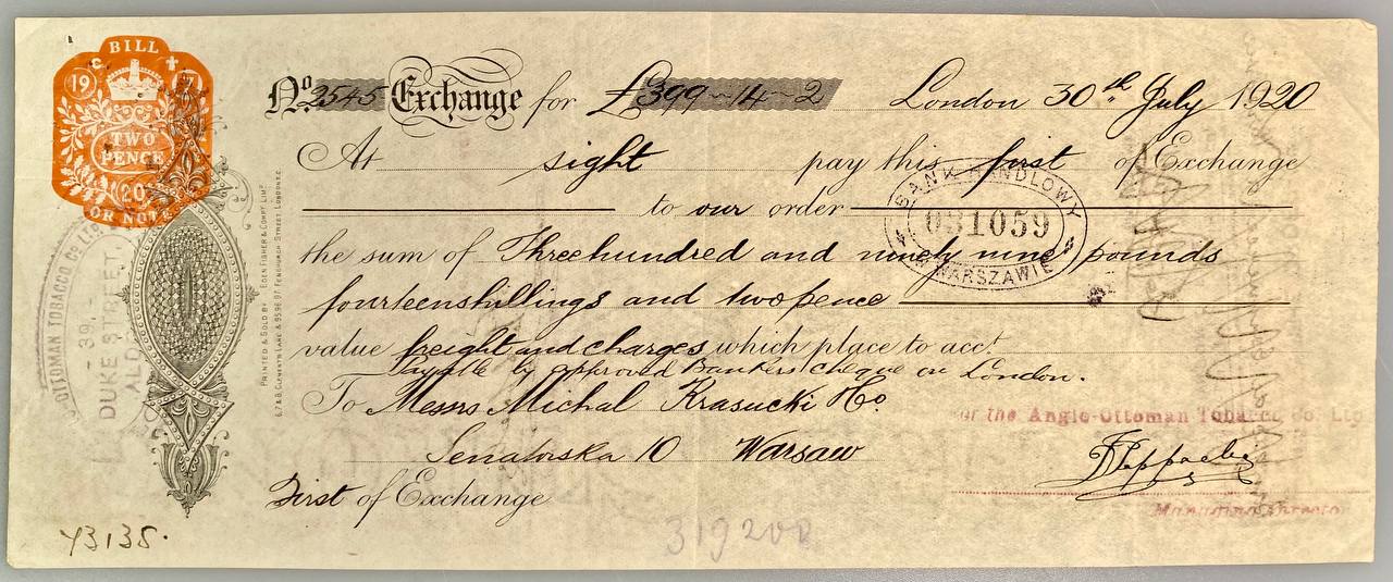 Ottoman Empire Anglo-Ottoman Tobacco Company Bill of Exchange 1920 Turkey