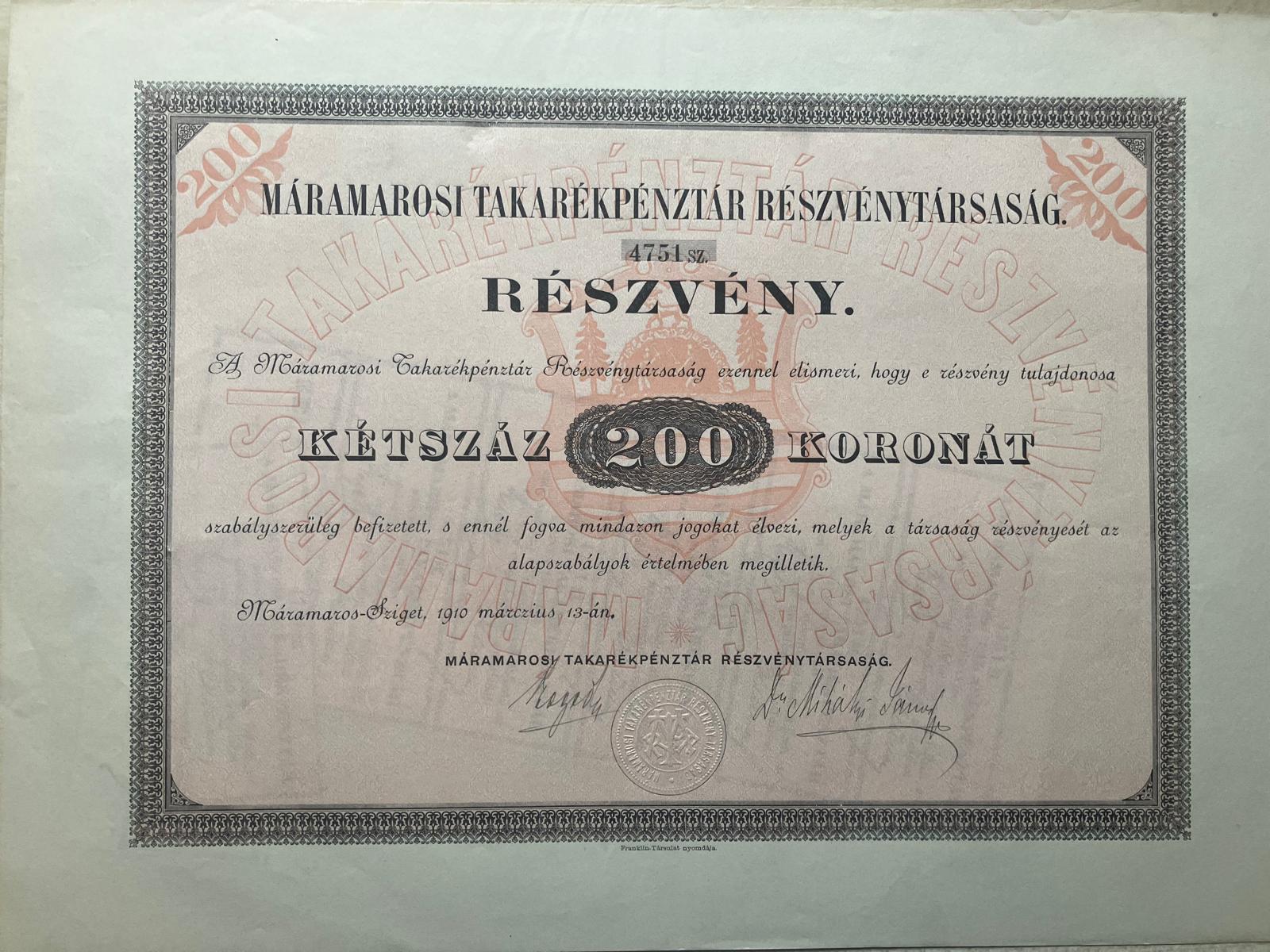 Scarce 1910 share issued by the Máramarosi Takarékpénztár Rt., the Savings Bank of Máramaros-Sziget. Features the Austro-Hungarian coat of arms and fine border engraving in pink and black. Important historical document from northern Transylvania’s pre-WWI banking system.