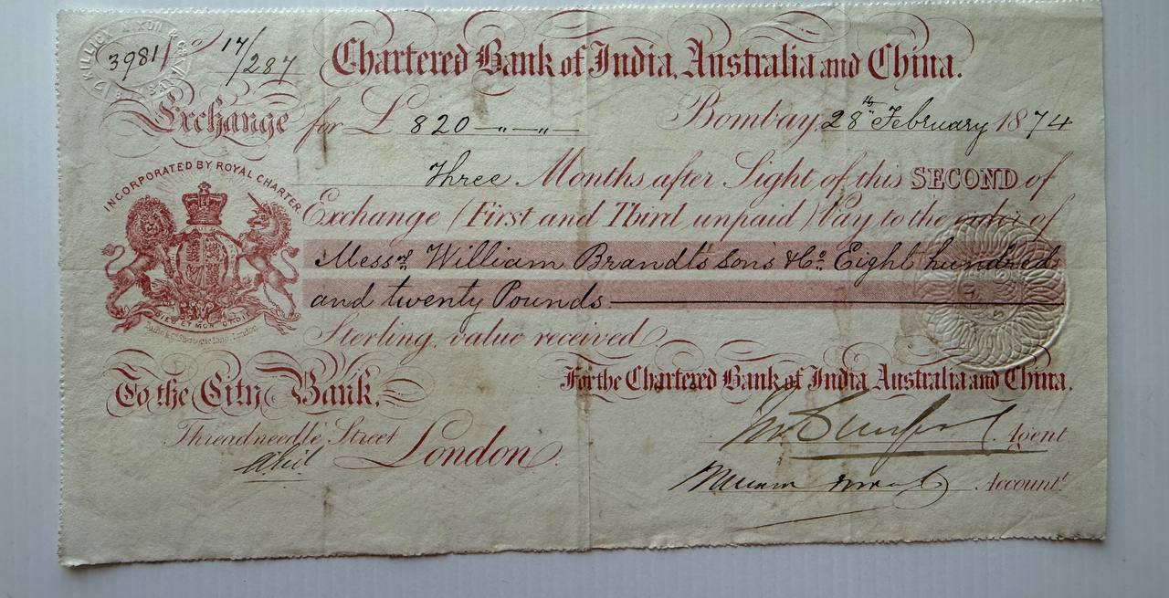 A stunning and richly printed bill of exchange from Bombay to London, 1874. Issued by the iconic Chartered Bank of India, Australia & China, in vibrant red ink and embossed seal. This document exemplifies colonial financial networks and high-value commercial transactions.