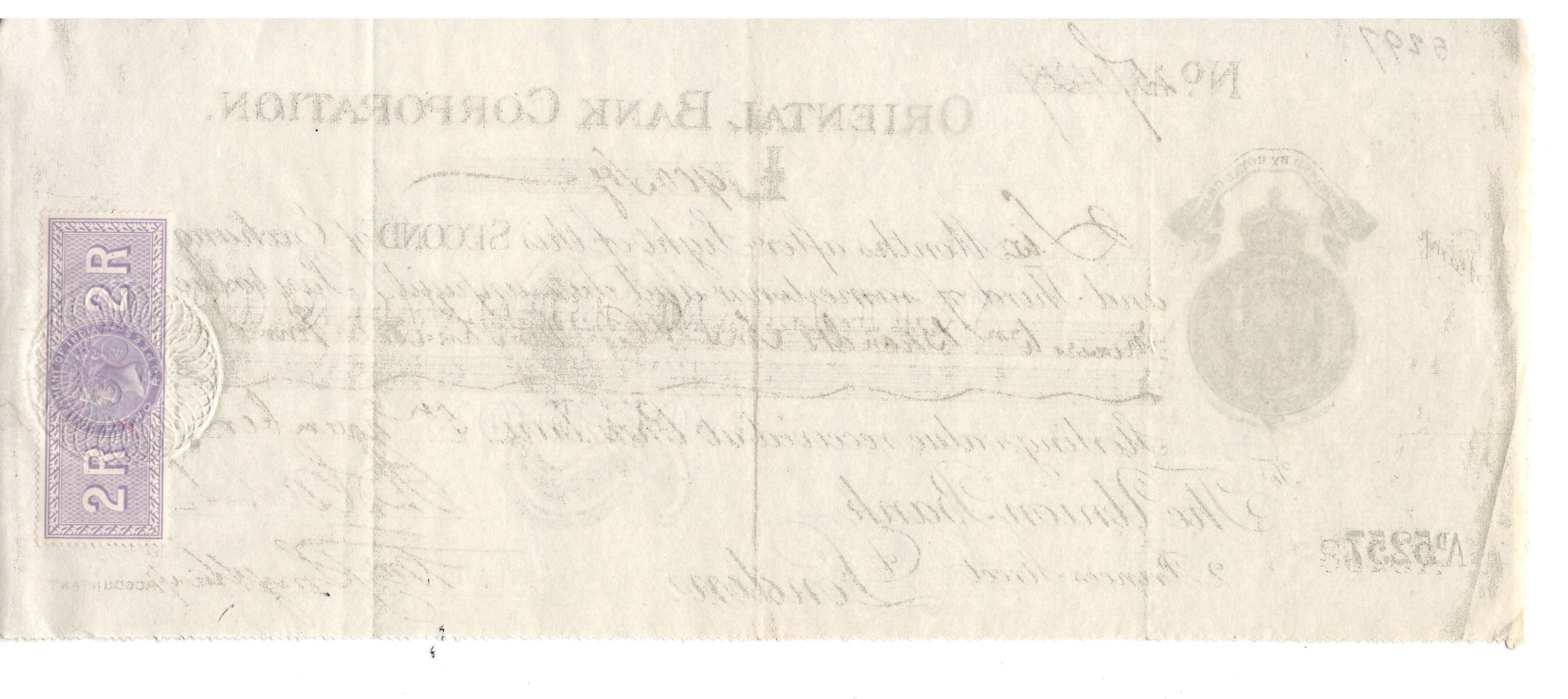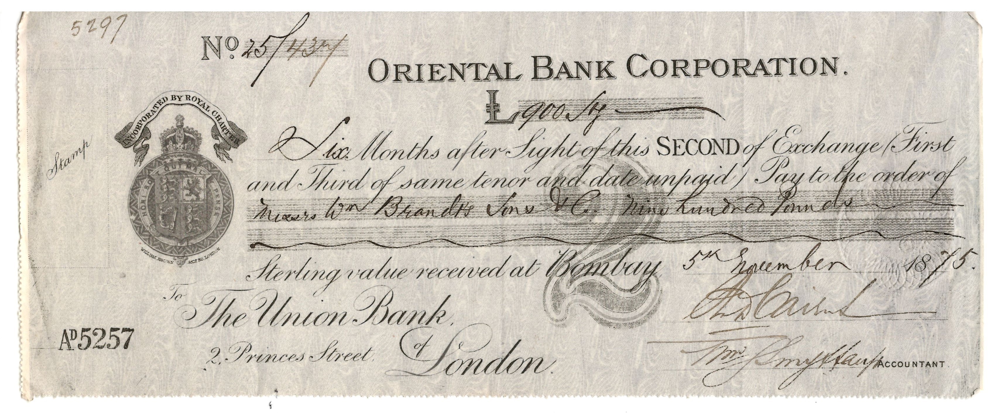 An exceptional specimen of 19th-century international finance: Bill of Exchange issued by the Oriental Bank Corporation in Bombay on 5 November 1875, payable six months after sight. This “Second of Exchange” was directed to The Union Bank of London, 2 Princess Street, and ordered the payment of £200 Sterling to Messrs. Wm. Brandt’s Sons & Co.