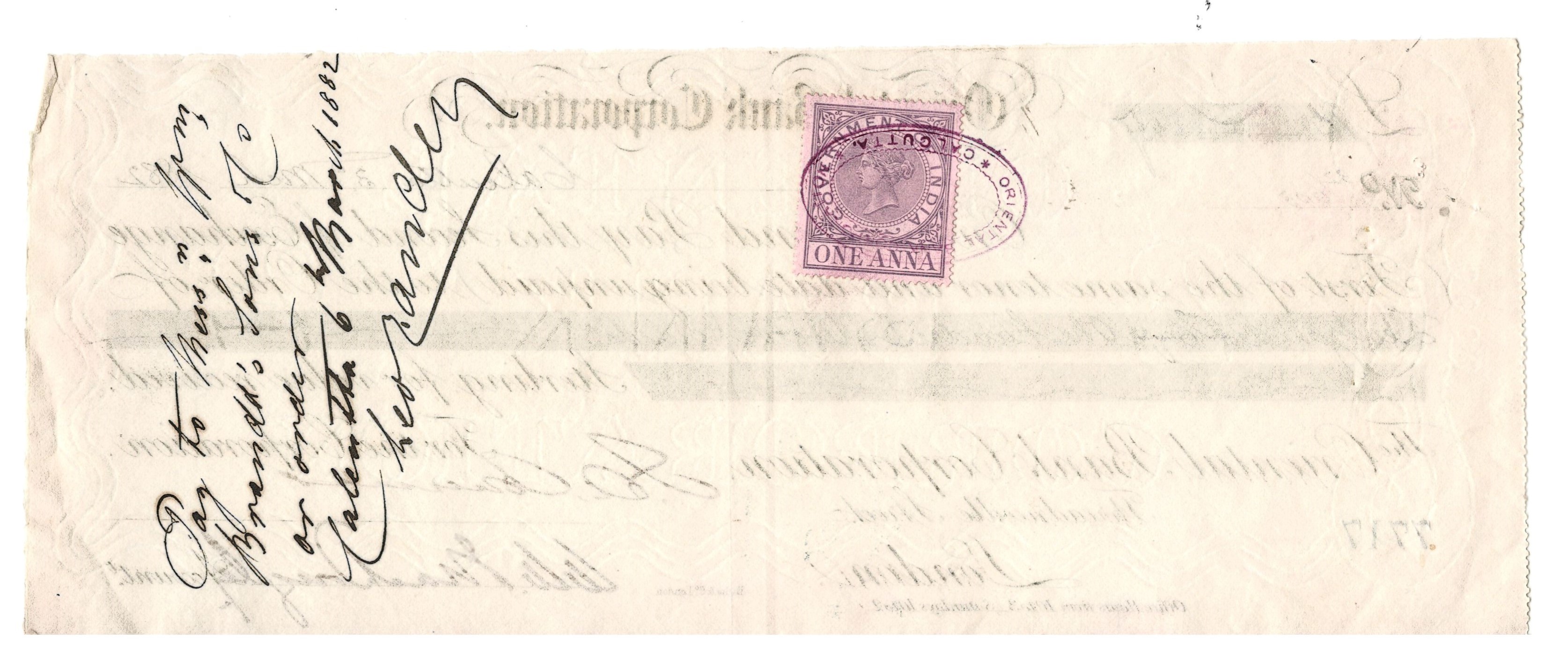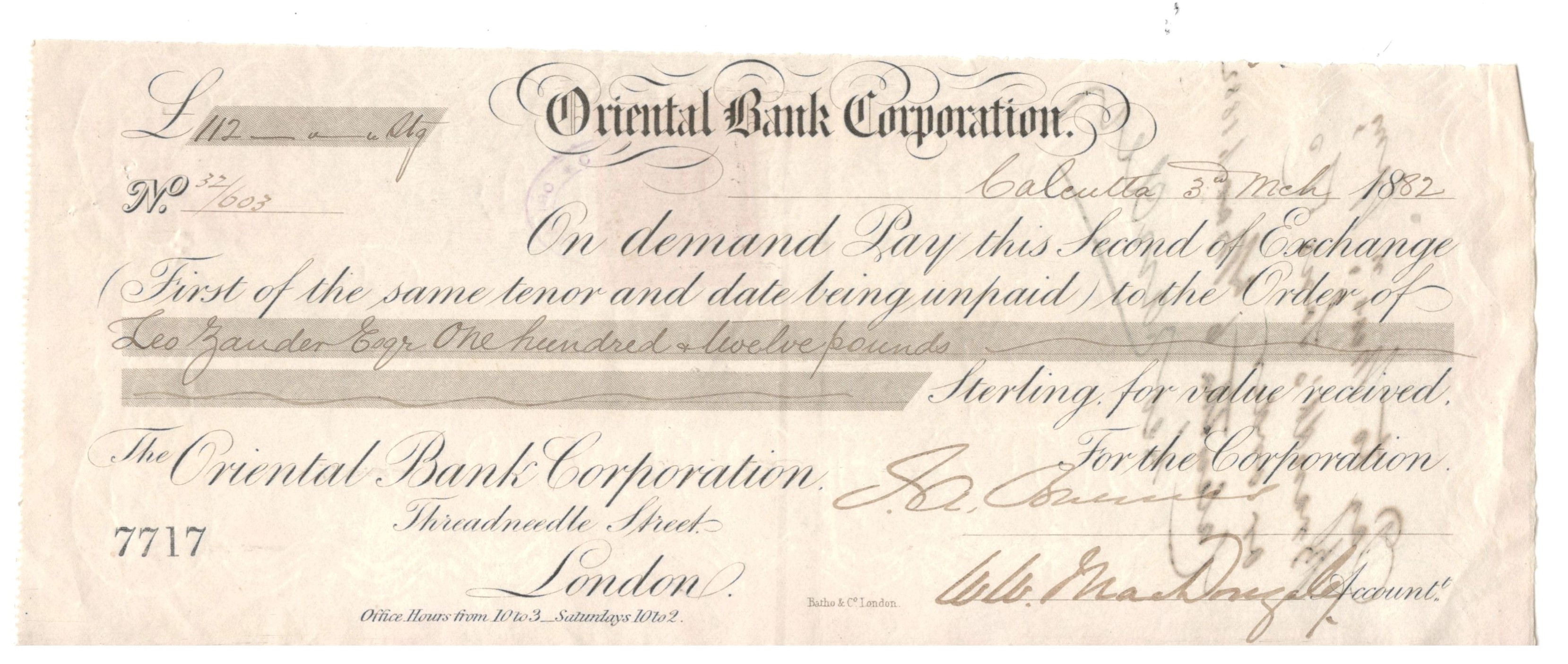 An original bill of exchange issued by the Oriental Bank Corporation, dated 3 March 1882, drawn in Calcutta and payable in London at their Threadneedle Street branch. This “Second of Exchange” was issued for £112 sterling, payable to Leo Zauder Esq. and signed by the bank’s representatives.