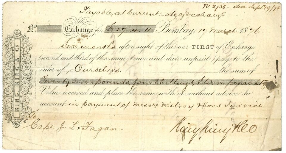 British India Bombay Mumbai 'King, King & Co' Bank Bill of Exchange 1876