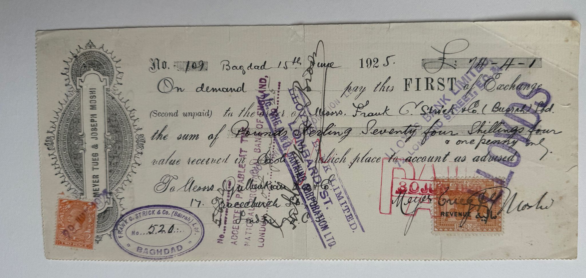 Bill of exchange dated 15 June 1925, issued in Baghdad by the trading firm Meyer Tweg & Joseph Moshi for £74.4.1 sterling. Drawn on Messrs. Frank C. Strick & Co. (Basrah) Ltd., payable in London to Gulbenkian Bros. & Co. Stamped by the National Bank of England, The Eastern Bank Ltd., and Frank C. Strick & Co., with multiple endorsements and vivid cancellation marks in violet and red. The document features dual adhesive revenues — British 2d and Iraqi 2 Annas — and bears the signatures of the Baghdad merchants. A highly desirable artifact of early 20th‑century Anglo‑Iraqi commercial exchange, illustrating active trade in the oil and shipping sectors between Basrah, Baghdad, and London.