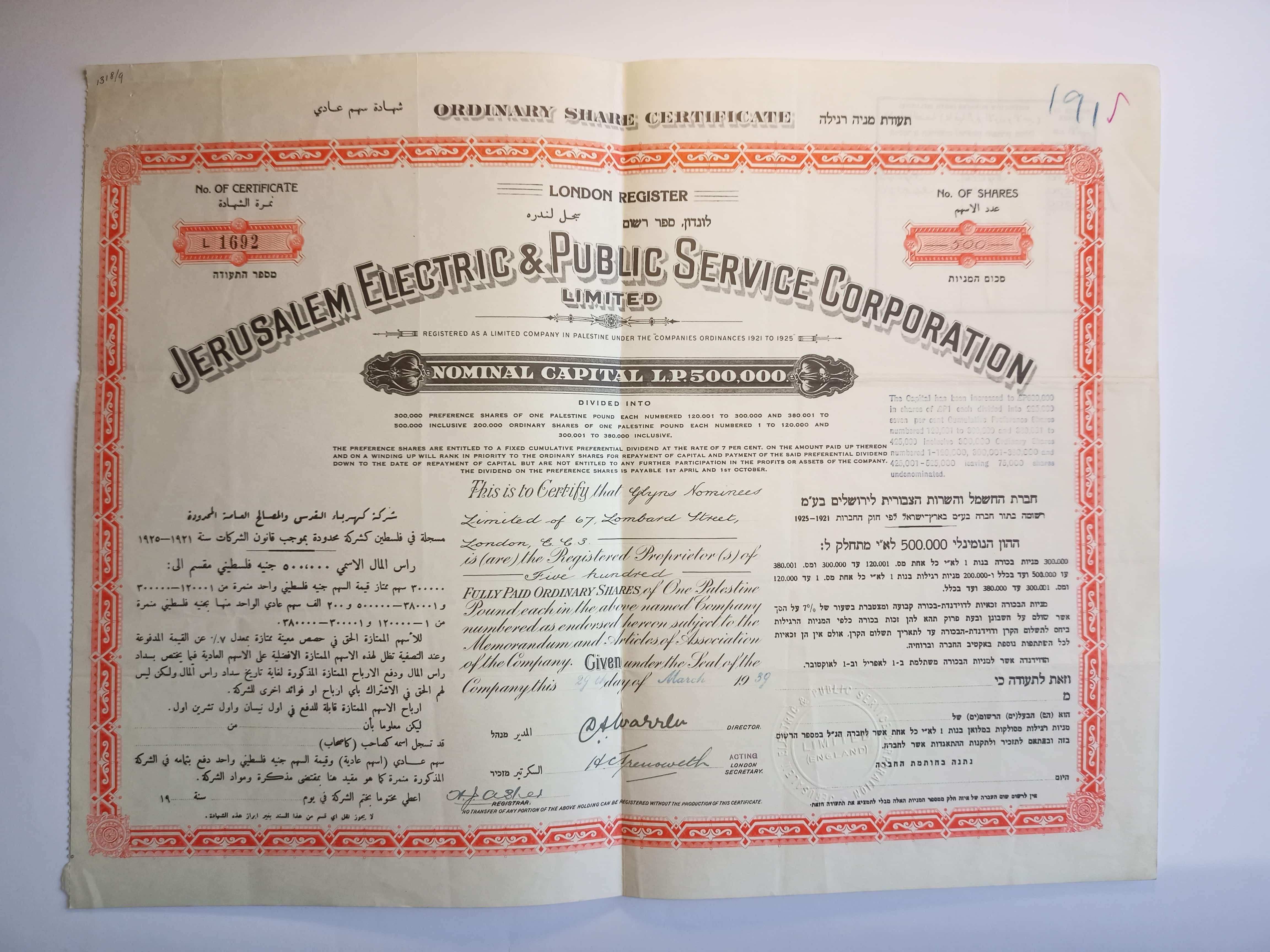 Historic share certificate issued by the Jerusalem Electric & Public Service Corporation Limited, registered in Palestine under the Companies Ordinances 1921–1925. Dated 1939, this Ordinary Share for 500 Mils showcases trilingual text (English, Hebrew, Arabic) with bold red decorative border. The company played a major role in developing electrical infrastructure in Mandate Palestine. Embossed seal and signatures present.