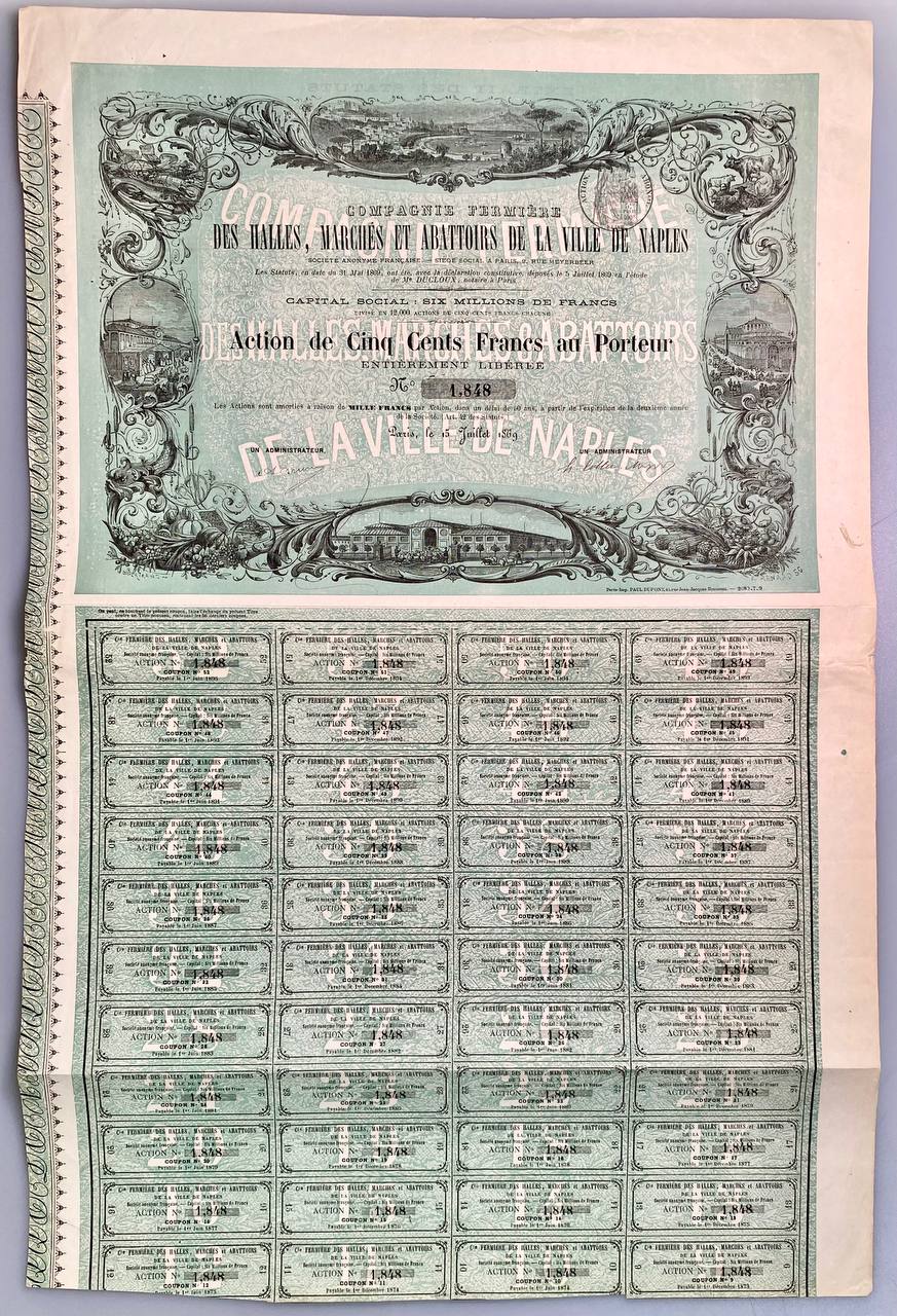 Italy Cie Fermière des Halles, Marchés et Abattoirs de la Ville de Naples Action de 500 Francs 1869