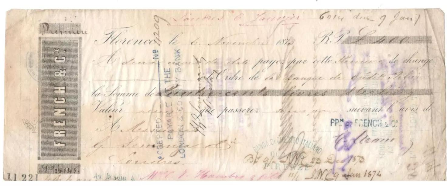 Italy Florence "French & Cie" Merchant Bank 1873 £400 Bill of Exchange Check