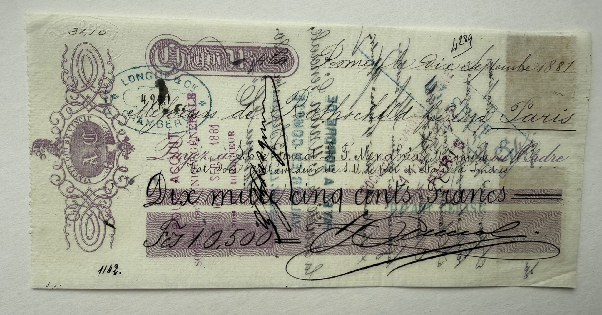 Elegant commercial bill of exchange issued in Rome on 10 September 1881 by Banca Gerassi (Gerassi & Cie), payable to the order of Rothschild Frères, Paris, for 10 500 francs. Printed on Italian stamped fiscal paper featuring the ornate “Vincit qui se vincit” cartouche. Multiple handwritten endorsements and bank stamps, including Long & Cie, Chambéry, showing its journey through French clearing channels.