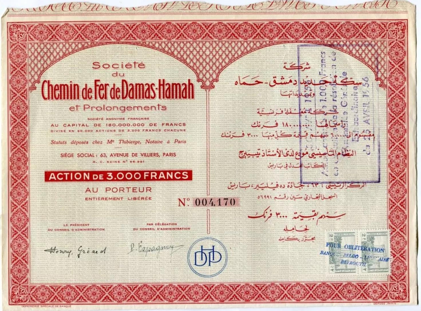 Colorful and historically rich share from the Société du Chemin de Fer de Damas-Hamah et Prolongements, a French company engaged in rail construction in the Levant region. Printed in both French and Arabic, this piece reflects colonial-era infrastructure projects and the economic reach of France in Syria. Beautiful red framing and unique typography.