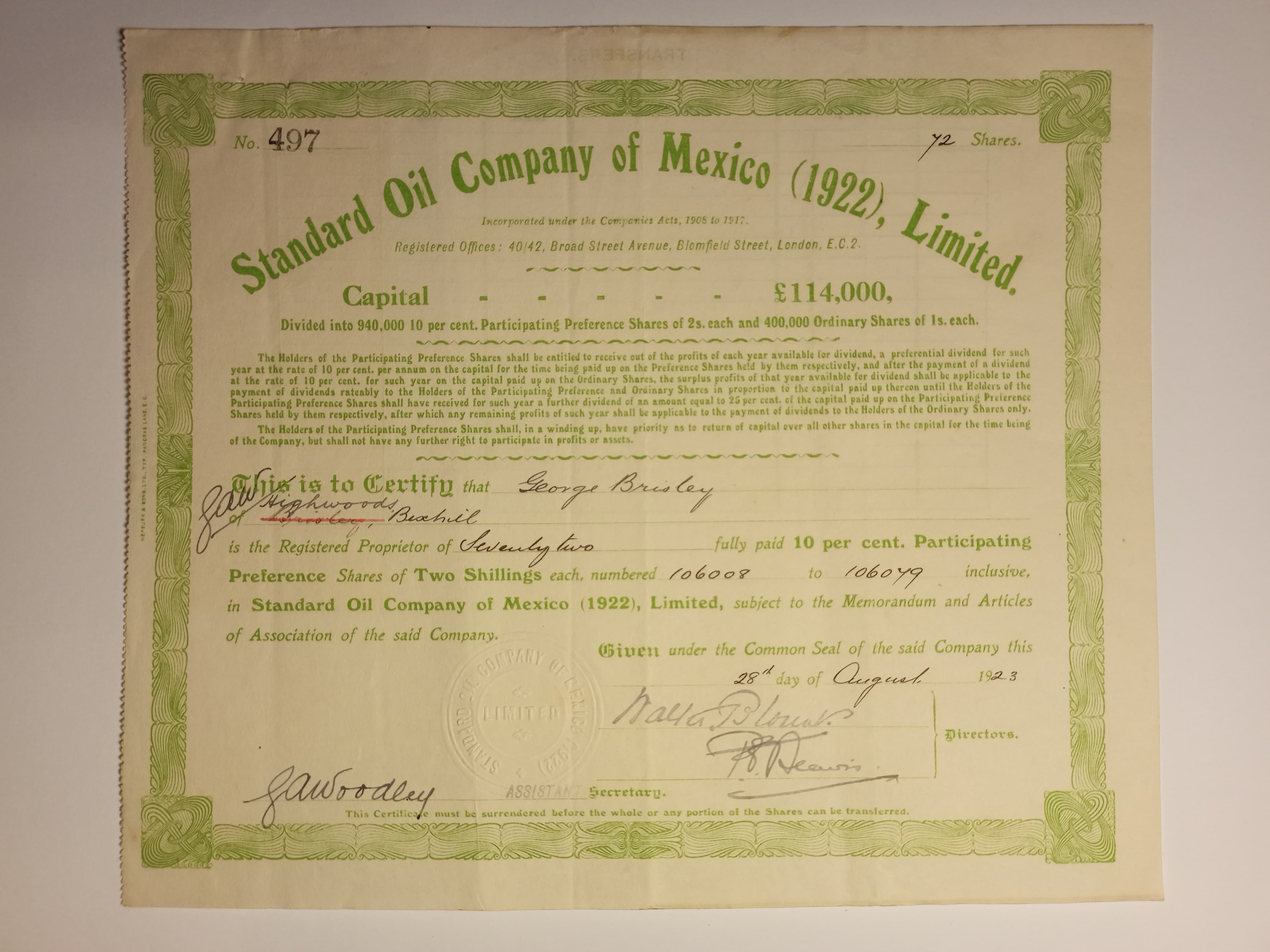 Share certificate for 72 Preference Shares of 2 shillings each in Standard Oil Company of Mexico (1922) Ltd., issued in 1923 and registered in London. The company was part of the Standard Oil operations in Mexico, engaged in petroleum exploration and distribution. Printed in green with embossed company seal.