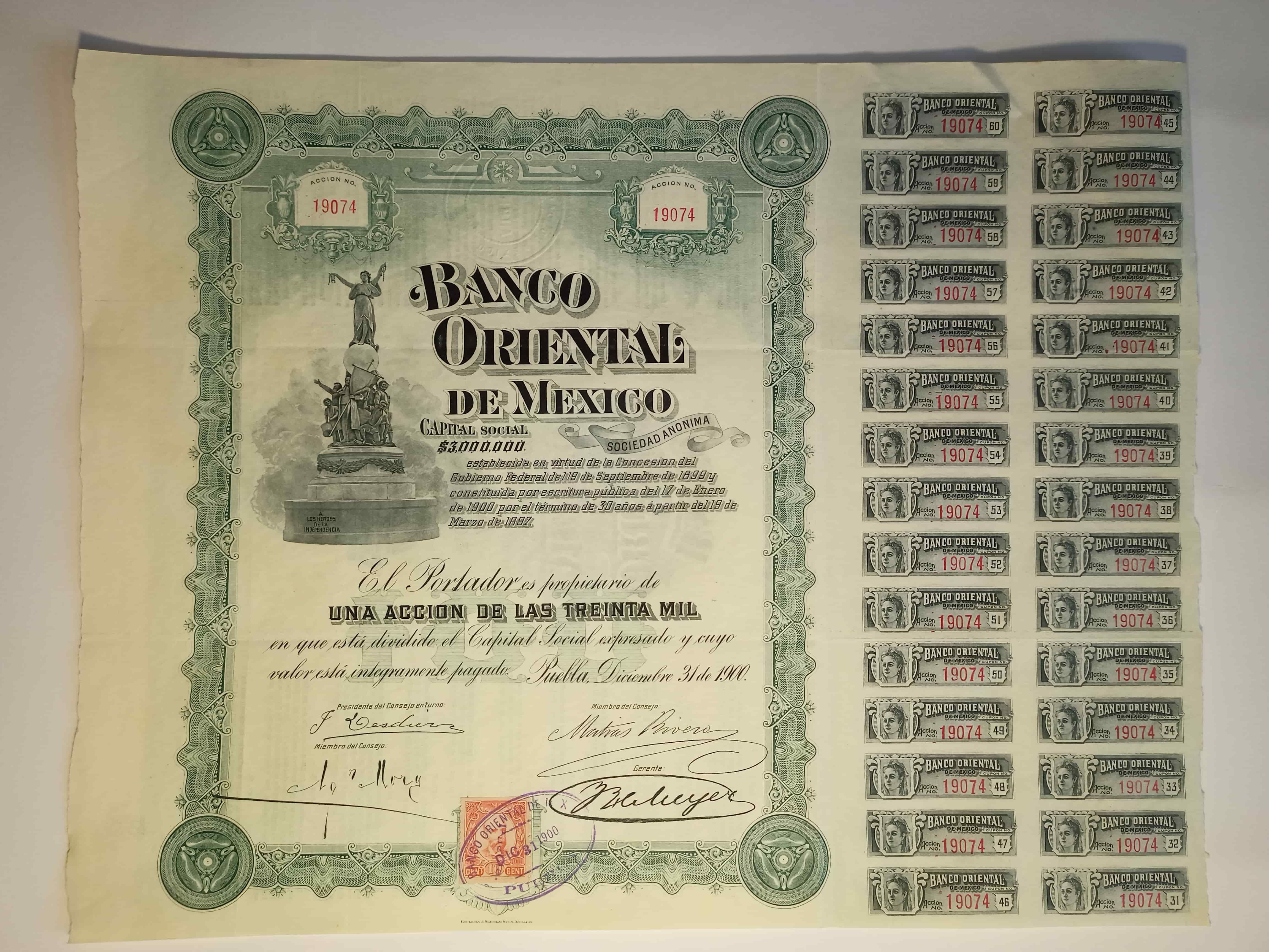 Rare 1900 Banco Oriental de Mexico share from Puebla, representing one share of the 30,000 issued. Founded in 1900, Banco Oriental was one of the major banks in Puebla region. Green design with vignette of Monumento a la Independencia. Includes complete set of attached coupons.