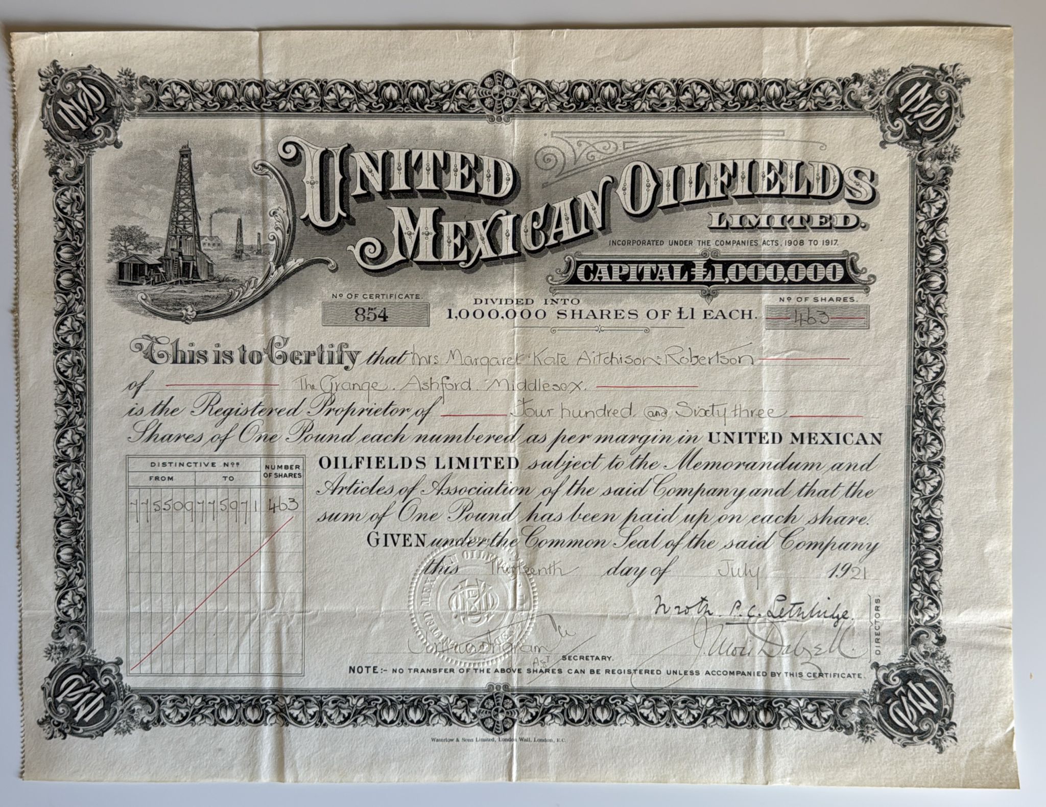 United Mexican Oilfields Ltd. – 1921 Share Certificate