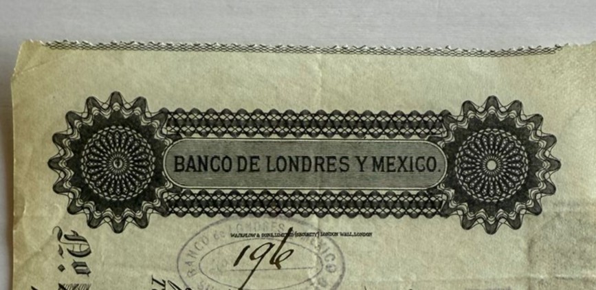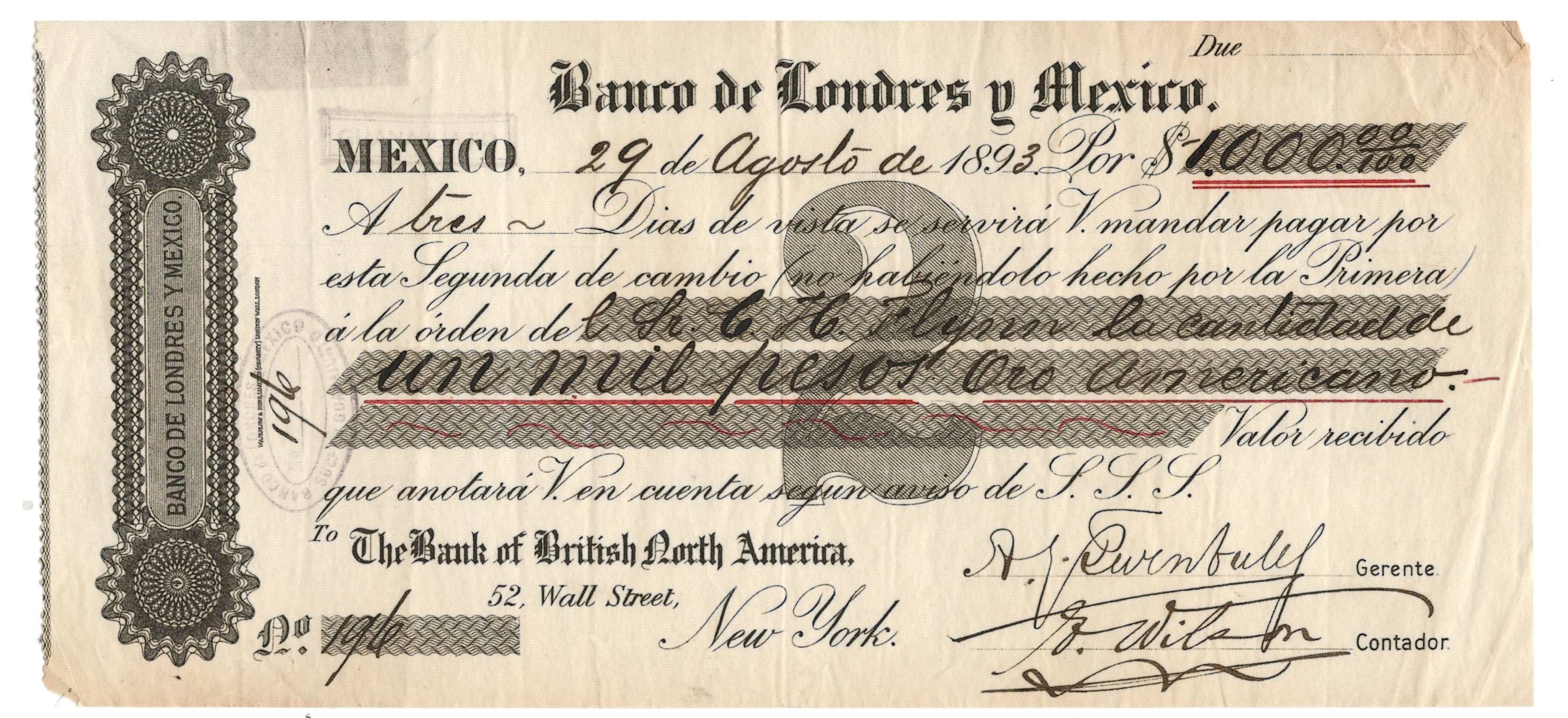 Highly attractive and scarce Second of Exchange issued in Mexico City by the Banco de Londres y México on 29 August 1893, instructing payment of $1,000 pesos in New York, via The Bank of British North America, 52 Wall Street.