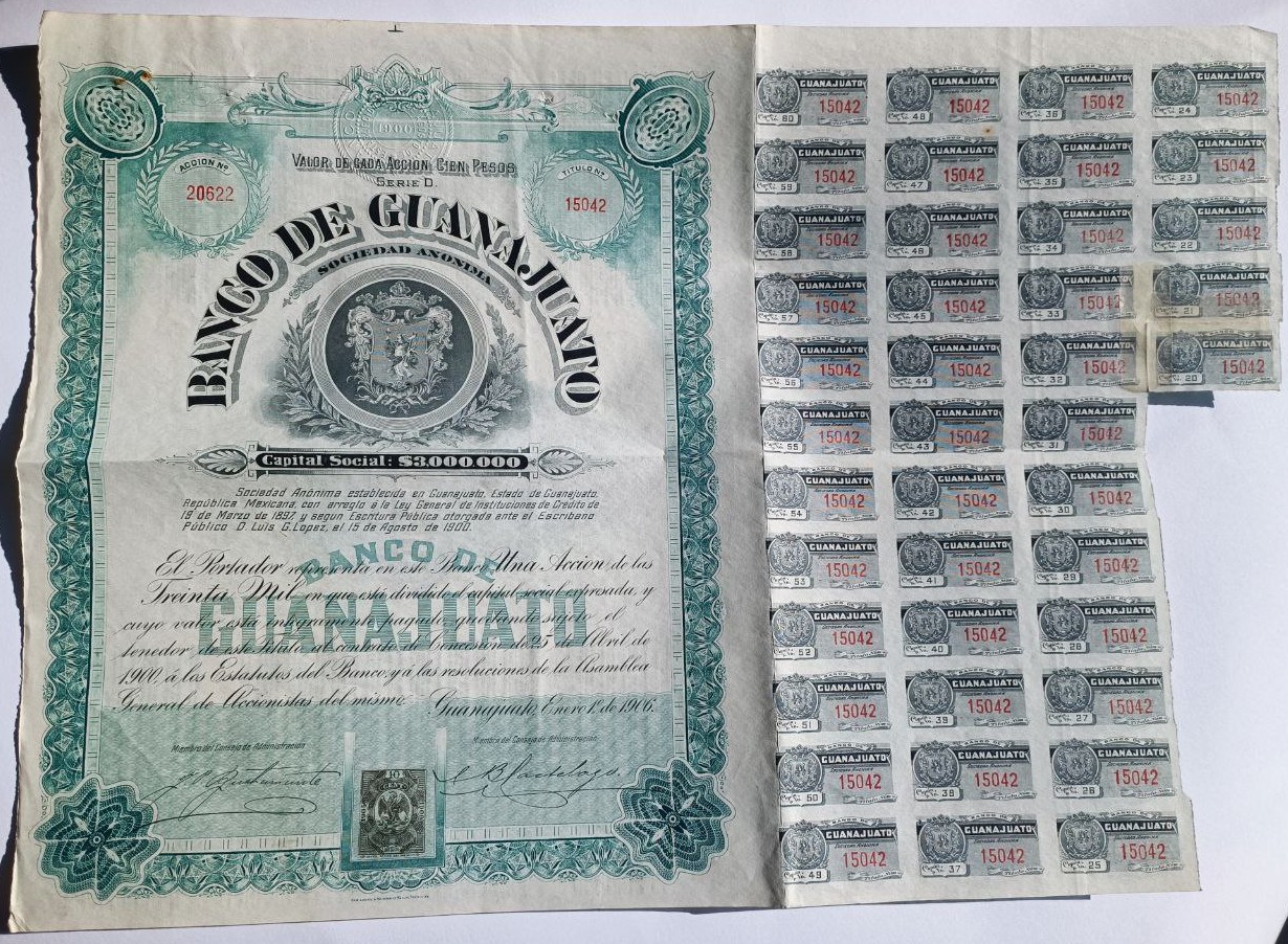 Mexico Banco de Guanajuato $100 share 1906 Accion Cupones