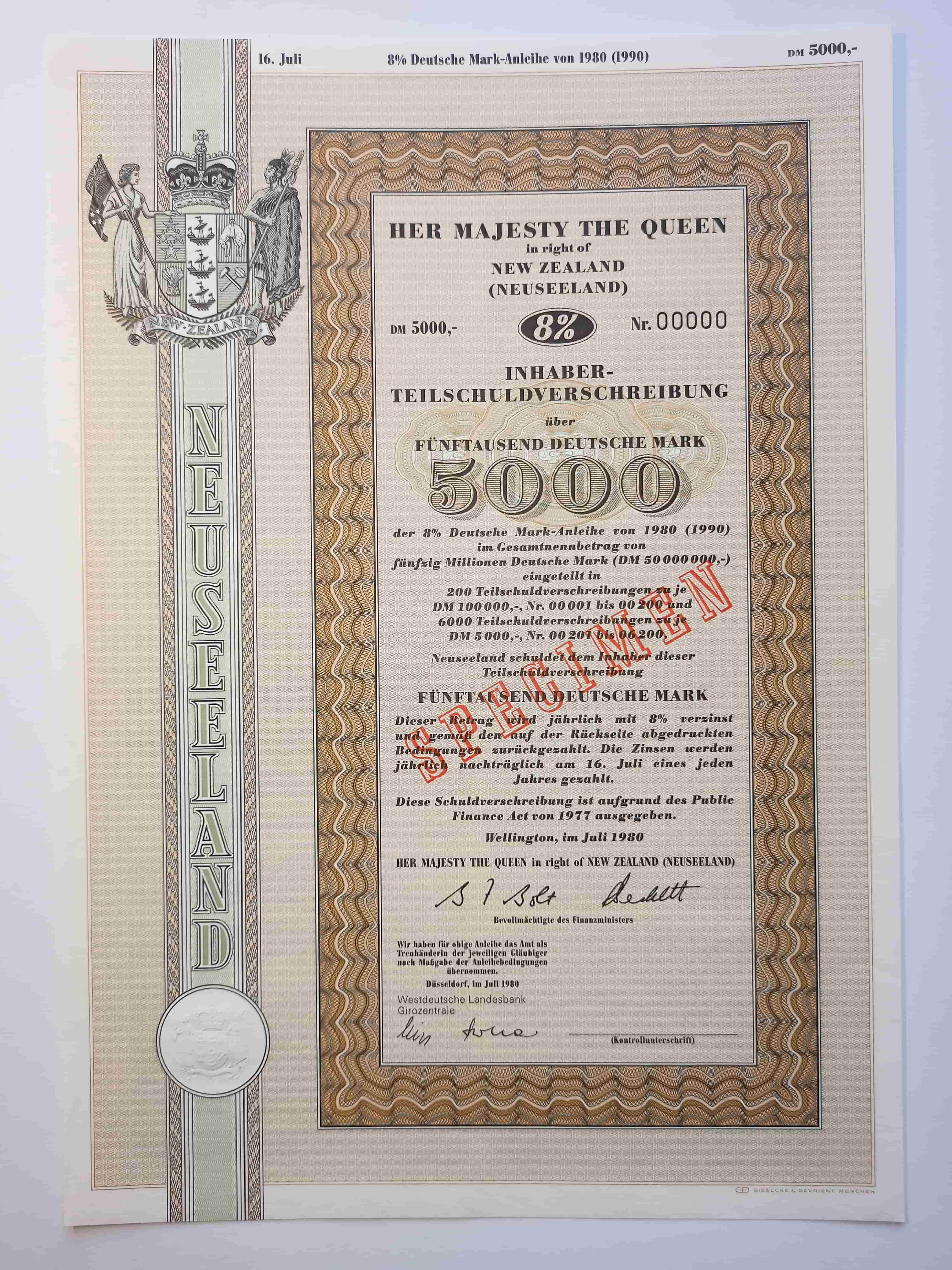 Rare German-language bond issued by New Zealand government in 1980 for 5000 Deutsche Mark, part of the 8% Deutsche Mark loan maturing 1990. Features New Zealand coat of arms and fine guilloche work. Bonds by sovereign states in foreign currencies appeal to global collectors.