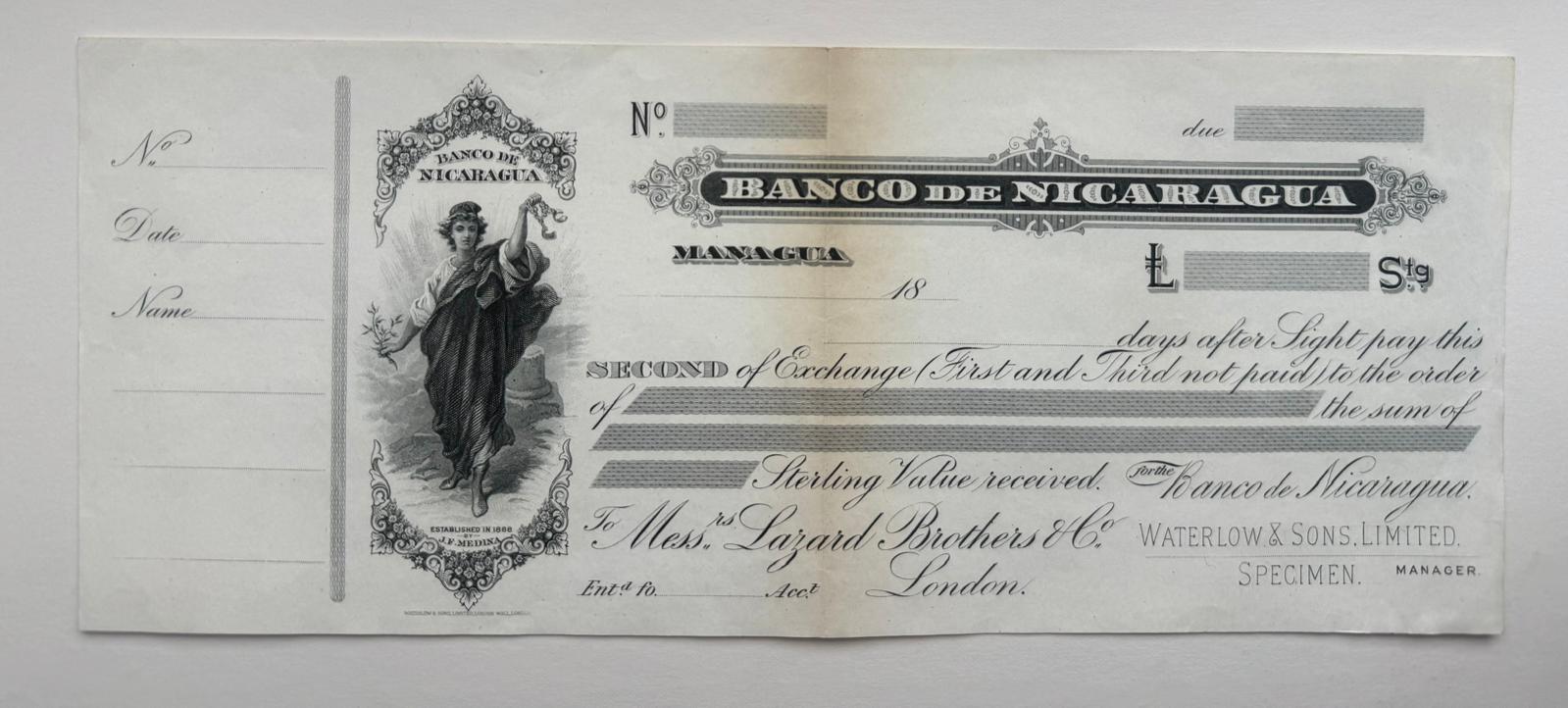 Elegant specimen bill of exchange issued by Banco de Nicaragua, engraved by Waterlow & Sons Ltd., London. Features an allegorical female figure representing Commerce, holding a caduceus and olive branch. This specimen highlights early Anglo-Nicaraguan financial ties through Lazard Brothers & Co. of London. Printed in fine steel engraving on crisp paper with ornate borderwork. A beautiful piece of Latin American financial history.