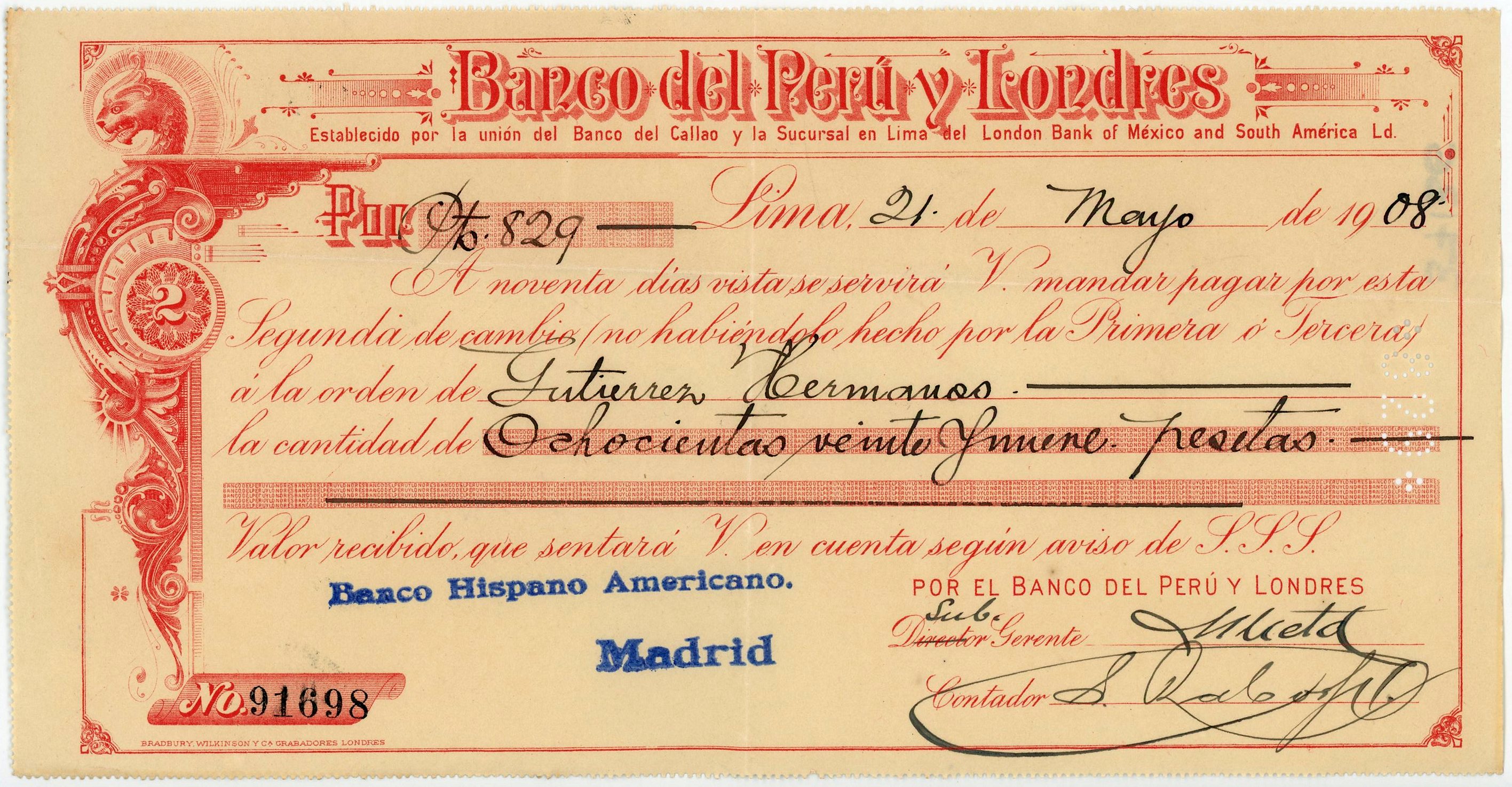 Peru Banco del Peru y Londres Lima Bill of Exchange Letra de Cambio 1909